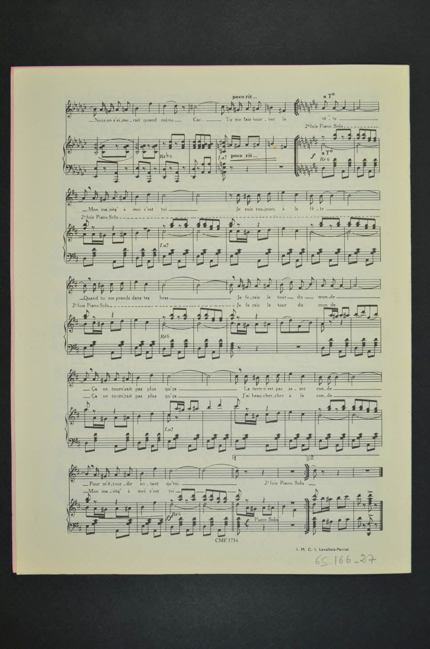 Des inscriptions renseignent le titre, les auteurs, les exécutants et l'éditeur. A l'intérieur et au dos, partition et les paroles de la chanson.Décor
