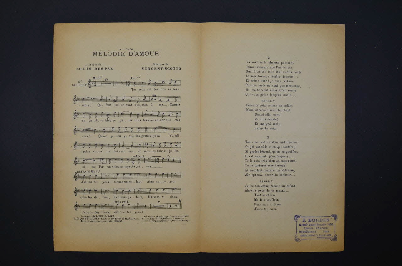 Feuillet rectangulaire en papier industriel imprimé. Le feuillet contient la partition et les paroles de la chanson. Au, dos, publicité pour l'éditeur.