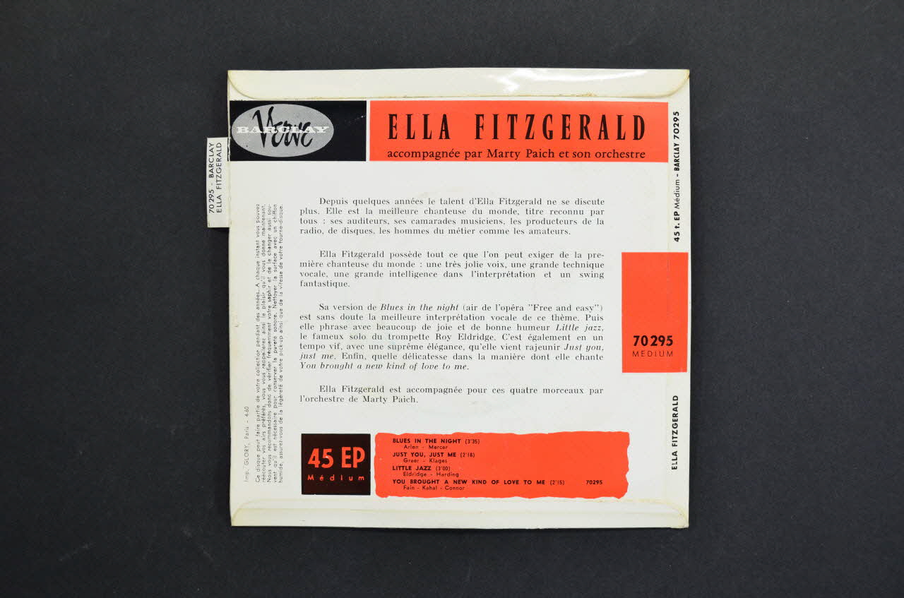 .2 Cette pochette de disque en papier cartonné est de format carré. Le recto comporte sur la gauche une photographie en noir et blanc de l'artiste au cours d'une performance vocale et sur la droite des inscriptions telles que ; le nom de l'interprète et les titres des chansons. Le verso laisse apparaître le nom de l'artiste et sa biographie, le titre des morceaux, de leurs auteurs et la durée de chacun d'eux. On y trouve par ailleurs les références à d'autres vedettes éditées par la maison de disques. Une languette, sur le côté supérieur gauche, indique le nom de l'interprète.