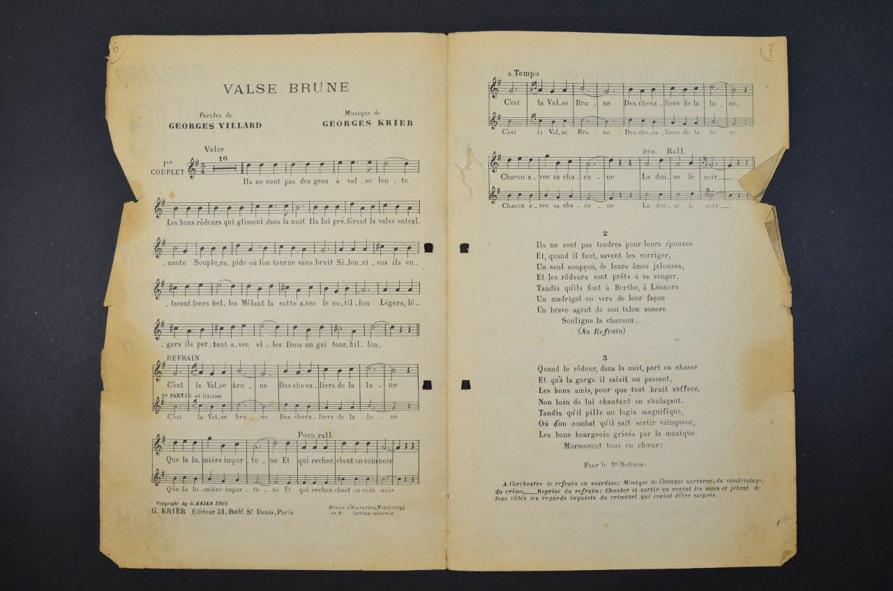 papier imprimé / Feuillet rectangulaire en papier industriel imprimé. Le feuillet contient la partition et les paroles de la chanson. Au dos, publicité pour l'éditeur.