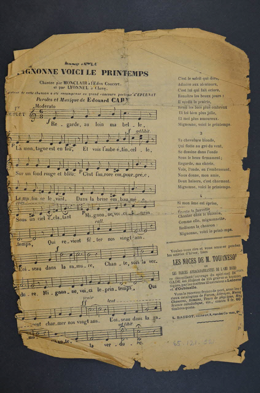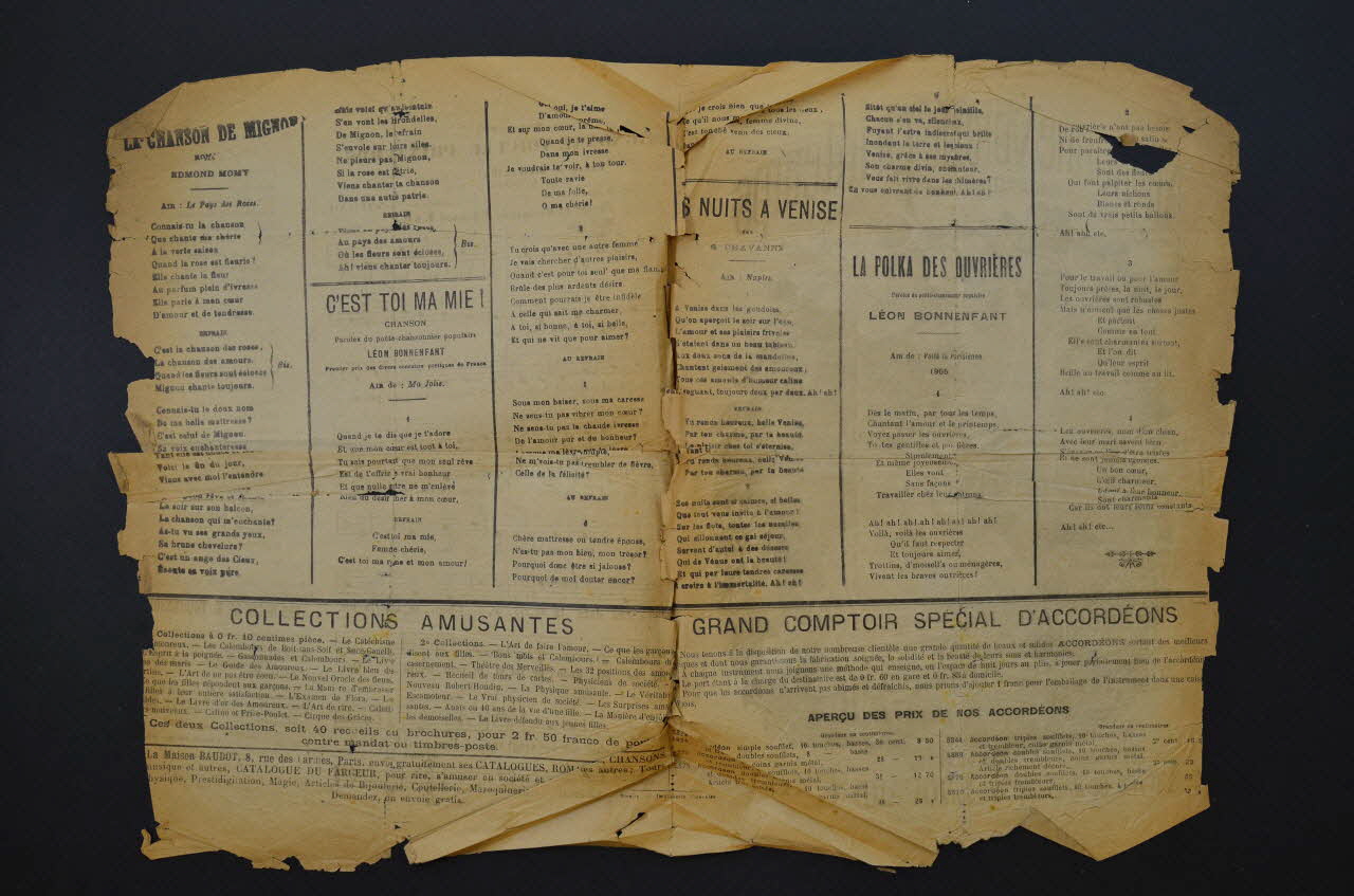 Les inscriptions renseignent le titre de la chanson, le nom des auteurs, de l'artiste et de l'éditeur. Au dos, partition et paroles de la chanson. A l'intérieur, liste d?autres partitions publiées par l?éditeur.Matériaux et techniques