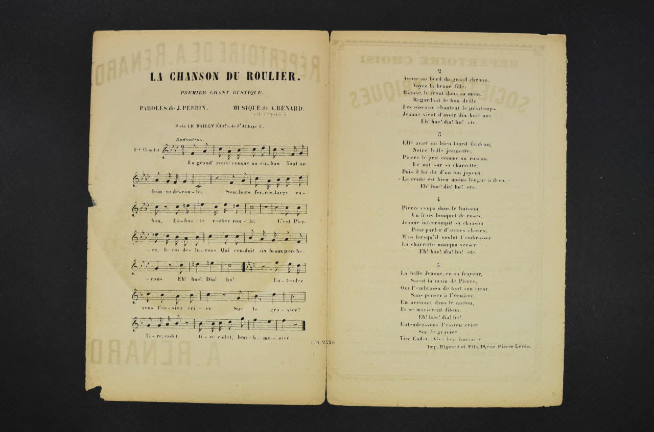 Des inscriptions renseignent l'auteur de la mélodie avec une liste des autres succès de Renard. A l'intérieur, partition et paroles de la chanson. Au dos, liste d'autres partitions publiées par l'éditeur.Décor