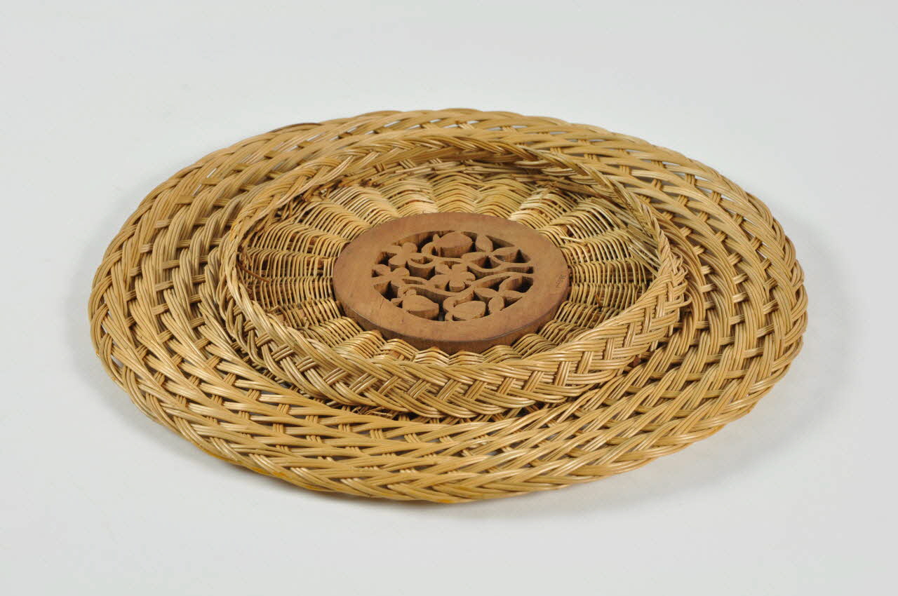 Vannerie à nappes perpendiculaires, en chèvre feuille, bords en nappes diagonales, texture-en-plein, départ-ajouté en bois, les montants sont assemblés à-tenon à vif dans la rondelle de bois centrale / Disque en vannerie avec un décor central circulaire en bois ajouré de fleurs et de fraise. Autour du disque, un décor de points en creux.
