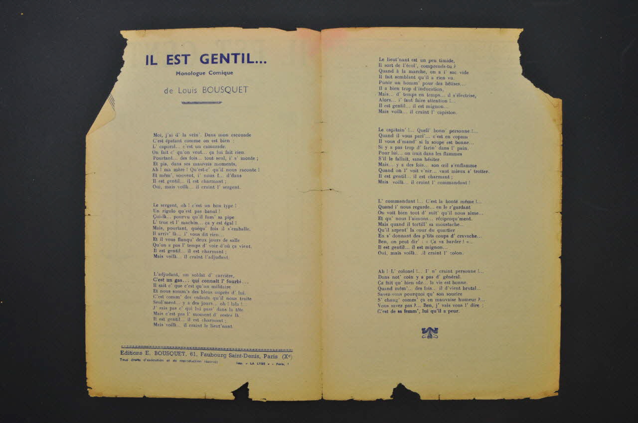 Sur la couverture, le portrait photographique du chansonnier Bach en tenue militaire, riant bouche ouverte, encadré de motifs décoratifs géométriques. Les inscriptions renseignent le titre de la chanson, le nom de l'auteur, de l'artiste et de l'éditeur. A l'intérieur, partition et paroles de la chanson. Au dos, liste d'autres partitions publiées par l'éditeur.Décor