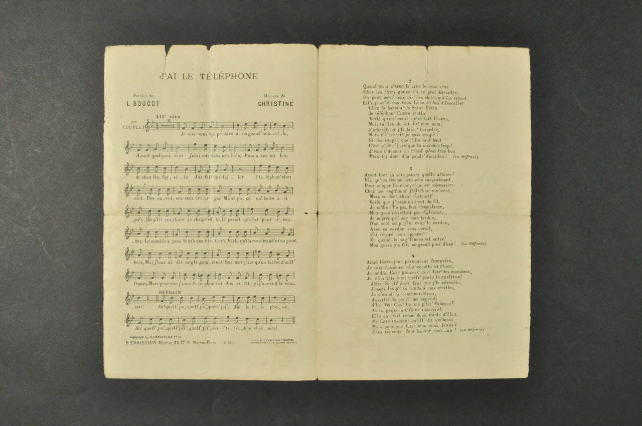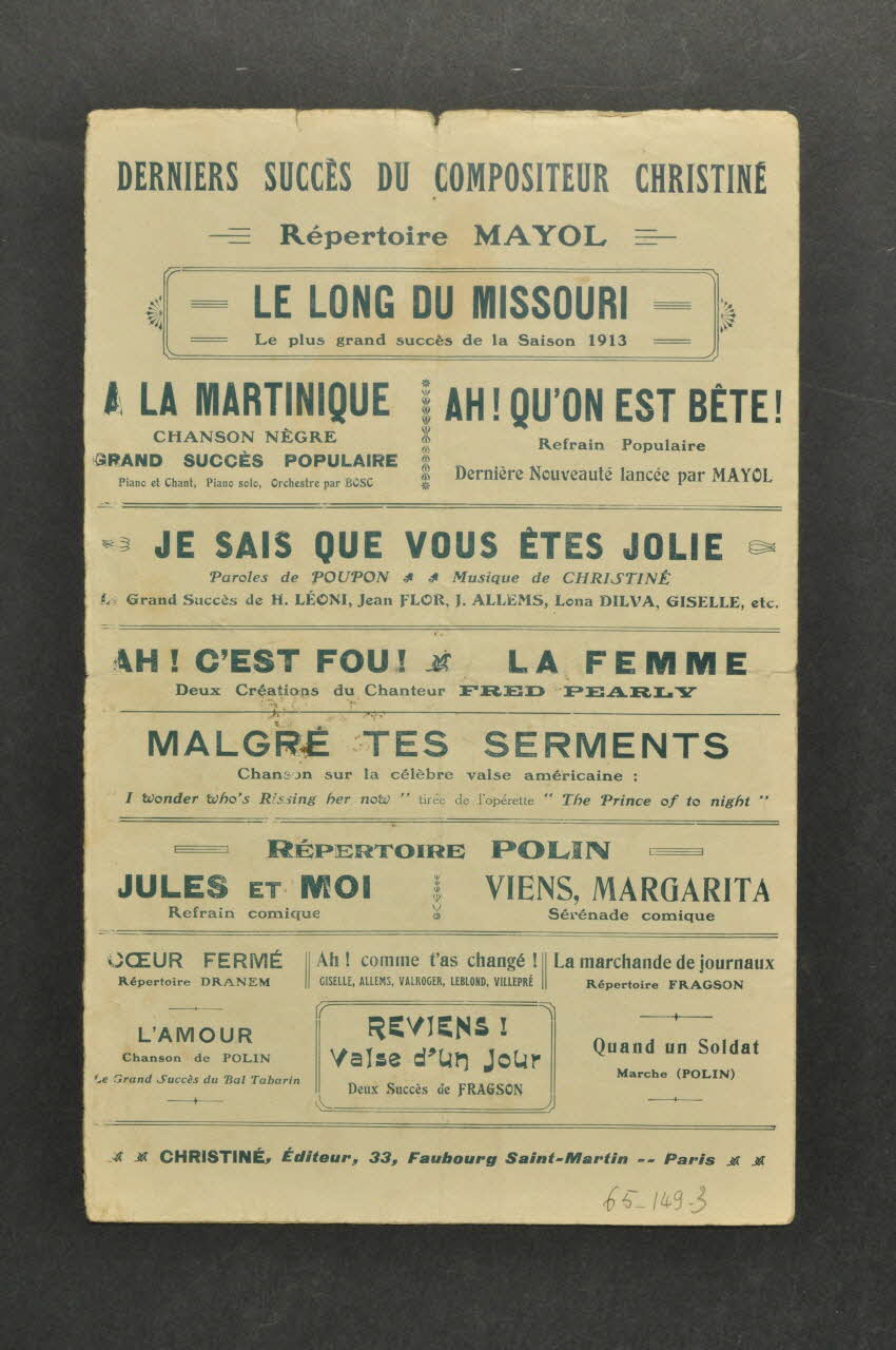 Les inscriptions renseignent le titre de la chanson, le nom des auteurs, de l'artiste et de l'éditeur. A l'intérieur, partitions et paroles de la chanson. Au dos, liste d?autres partitions publiées par l?éditeur.Décor