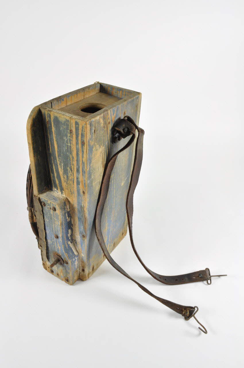 Contenant en bois, de forme rectangulaire, composé de planches peintes en bleu, clouées. A l'avant est relisé un soufflet de cuir, fermé par une planche de bois munie de trois vis à écrous papillon et évidée d'un disque fermé par une grille métallique. La pompe se porte sur le dos par deux lanières en cuir, clouées à l'arrière. Sur un côté du contenant est fixé un tuyau métallique.