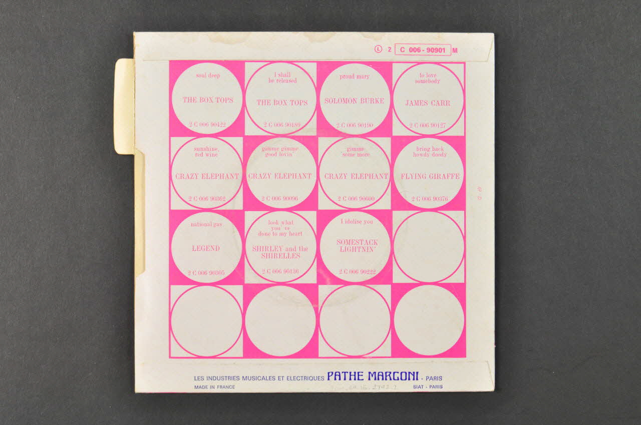 Il est conservé dans une pochette .2 en papier de forme carrée. La face avant est illustrée d'une photographie en rose de deux hommes et deux femmes assis dans un lit, adossés à la tête de lit. Le nom du film et les titres sont inscrits en rose et bleu sur bandeau supérieur blanc. Une petite languette prédécoupée dépasse du haut du bord droit ; elle reprend en bleu les informations principales sur le disque. L'arrière est blanc avec des titres d'autres disques, en rose dans des cercles roses inscrits dans des carrés.Matériaux et techniques