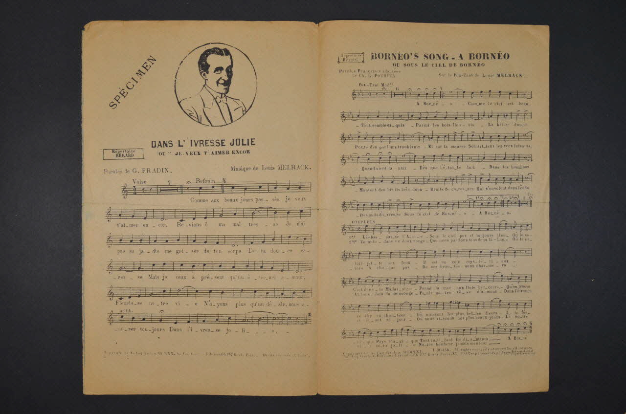 La première page présente le portrait de Bérard. Les inscriptions précisent le titre de la chanson, l'auteur et l'éditeur. A l'intérieur se trouvent la partition et les paroles de la chanson. Au dos se trouve une liste des morceaux disponibles chez le même éditeur.Décor