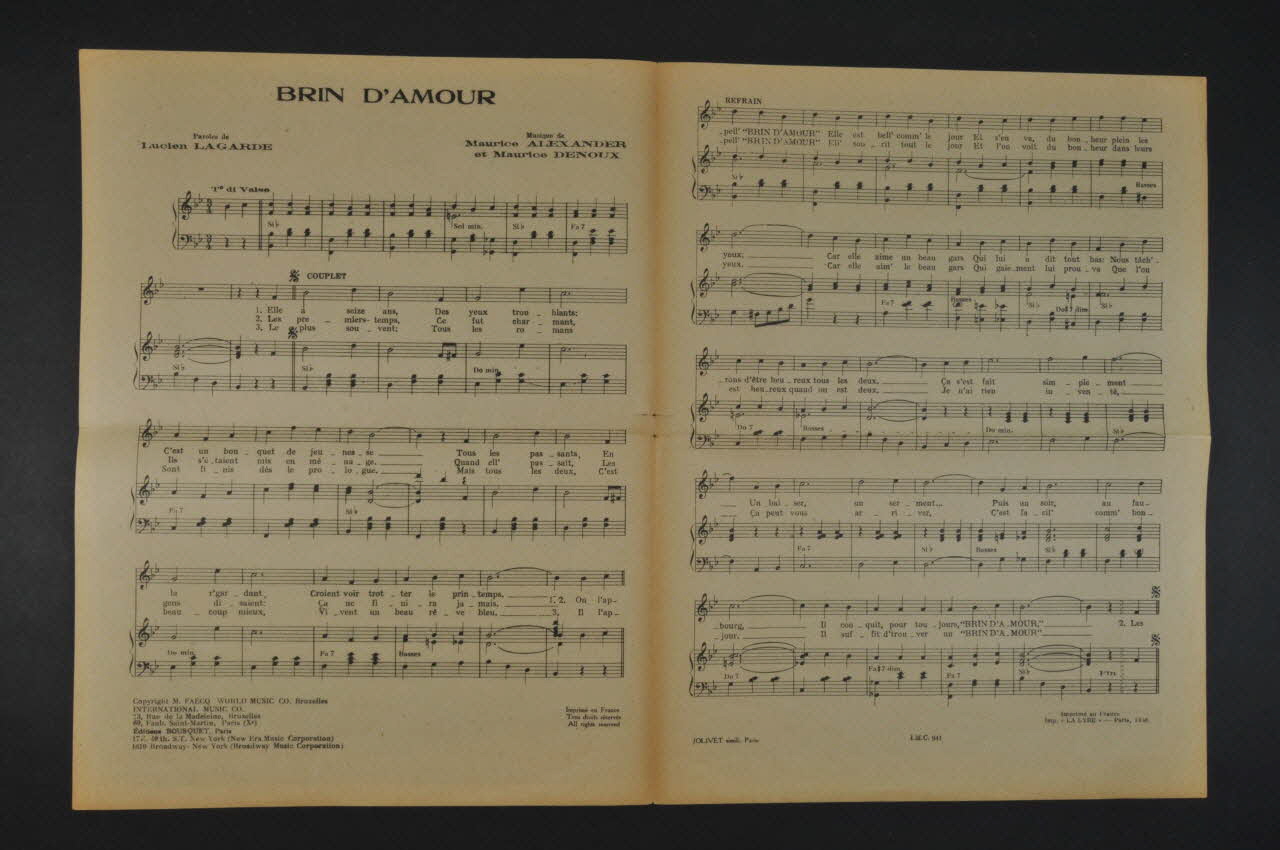 Les inscriptions renseignent le titre de la chanson, le nom des auteurs, de l'artiste et de l'éditeur. A l'intérieur, partitions et paroles de la chanson. Au dos, liste d?autres partitions publiées par l?éditeur.Décor