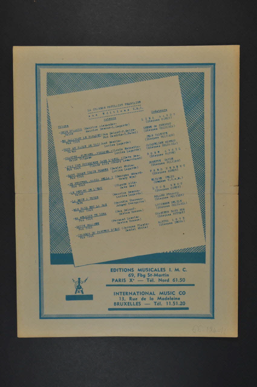 Feuillet rectangulaire en papier industriel, imprimé à l?encre bleue (sauf l?intérieur à l?encre noire). La couverture du feuillet présente la photographie de Lina Margy.
