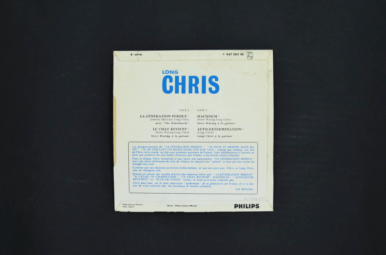 Au recto figurent le nom de l'artiste et les titres des chansons dans la partie supérieure. Au centre, se trouve un portrait noir et blanc du chanteur. Le logo de l'éditeur figure également dans le coin supérieur droit. Le verso comporte le nom du chanteur en bleu, les titres des chansons ainsi qu'un présentation du chanteur dans un cadre bleu sur fond blanc.Matériaux et techniques
