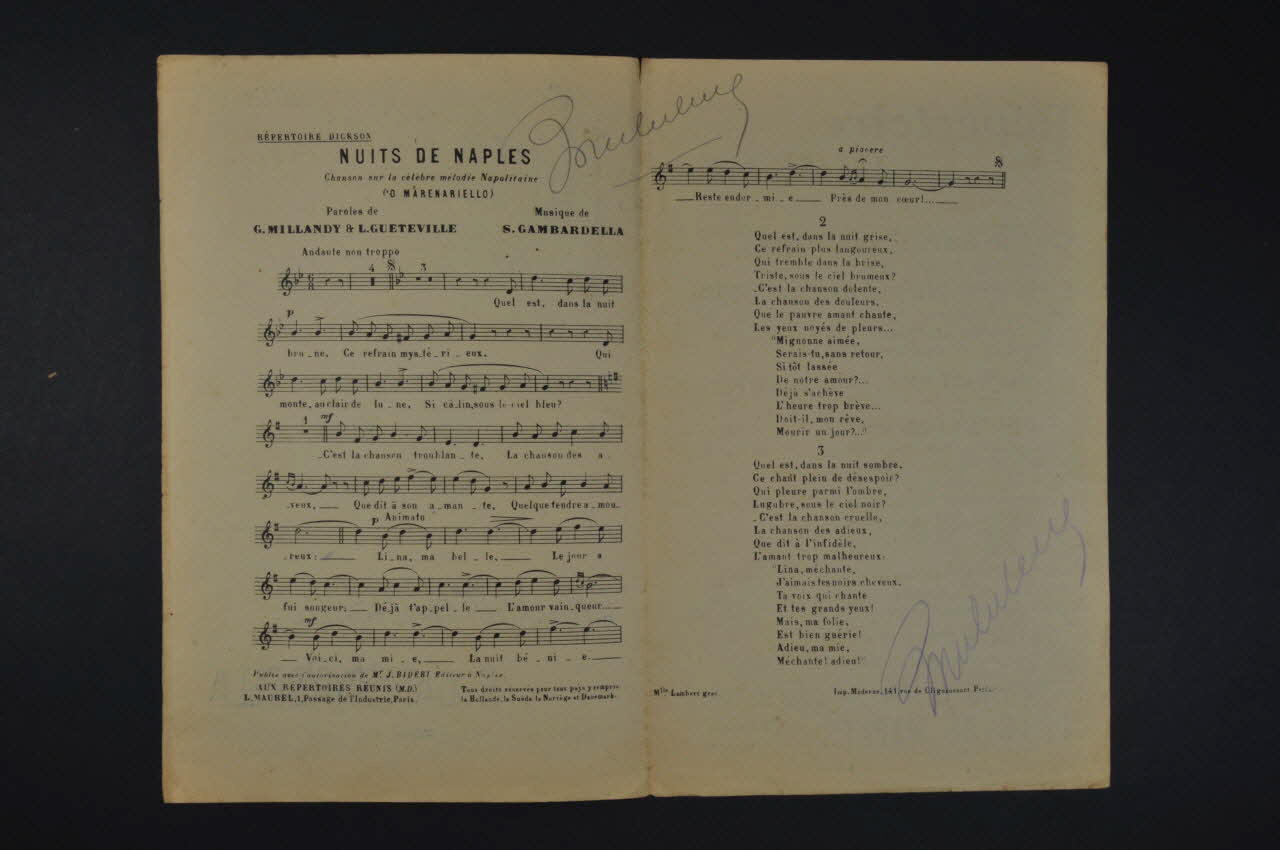 Des inscriptions renseignent le titre, les auteurs, les exécutants et l'éditeur. A l'intérieur, partition et paroles de la chanson. Au dos, liste d'autres partitions publiées par l'éditeur.Décor