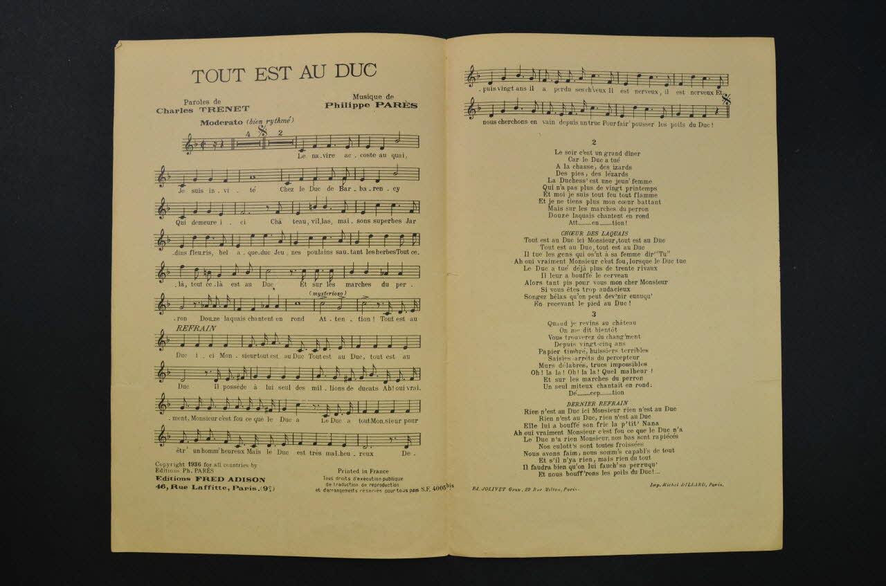 Les inscriptions renseignent le titre de la chanson, le nom des auteurs, de l'artiste et de l'éditeur. A l'intérieur, partition et paroles de la chanson. Au dos, liste d?autres partitions publiées par l?éditeur.Décor
