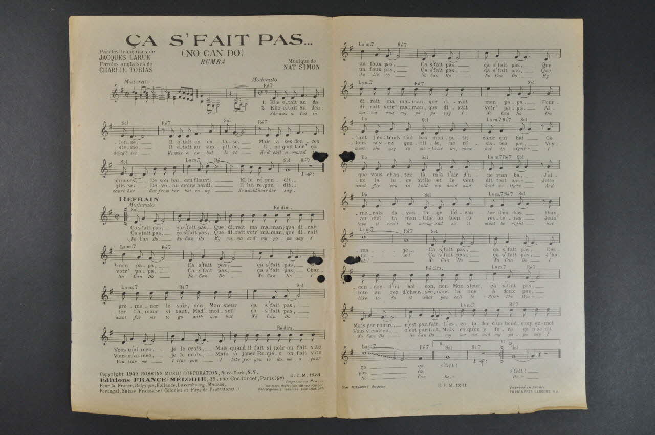La première page présente la photographie de Jacques Hélian. Les inscriptions précisent le titre de la chanson, l'auteur et l'éditeur. A l'intérieur se trouvent la partition et les paroles de la chanson. Au dos, une liste de morceaux disponibles chez le même éditeur.Matériaux et techniques