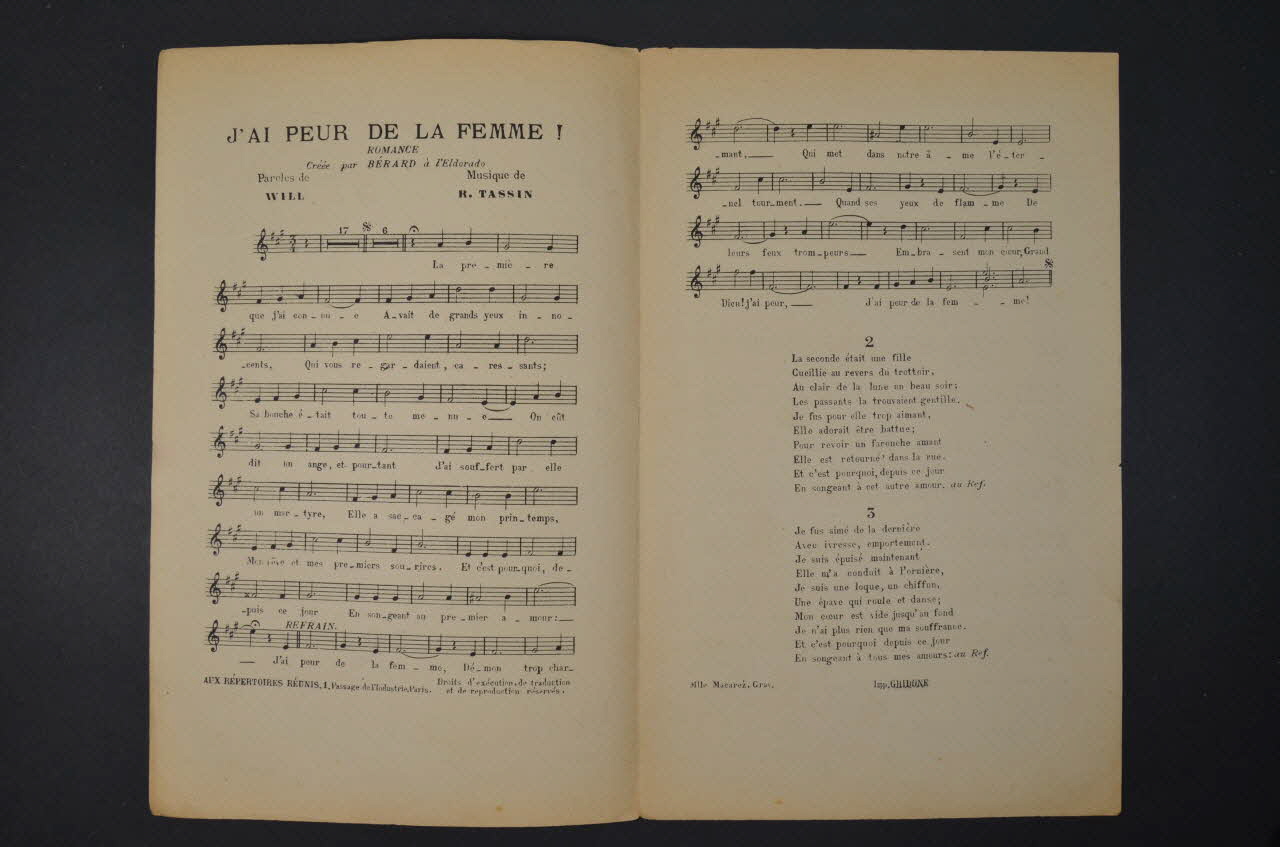 Des inscriptions renseignent le titre, les auteurs, les exécutants et l'éditeur. A l'intérieur, partition et paroles de la chanson. Au dos, liste d'autres partitions publiées par l'éditeur.Matériaux et techniques