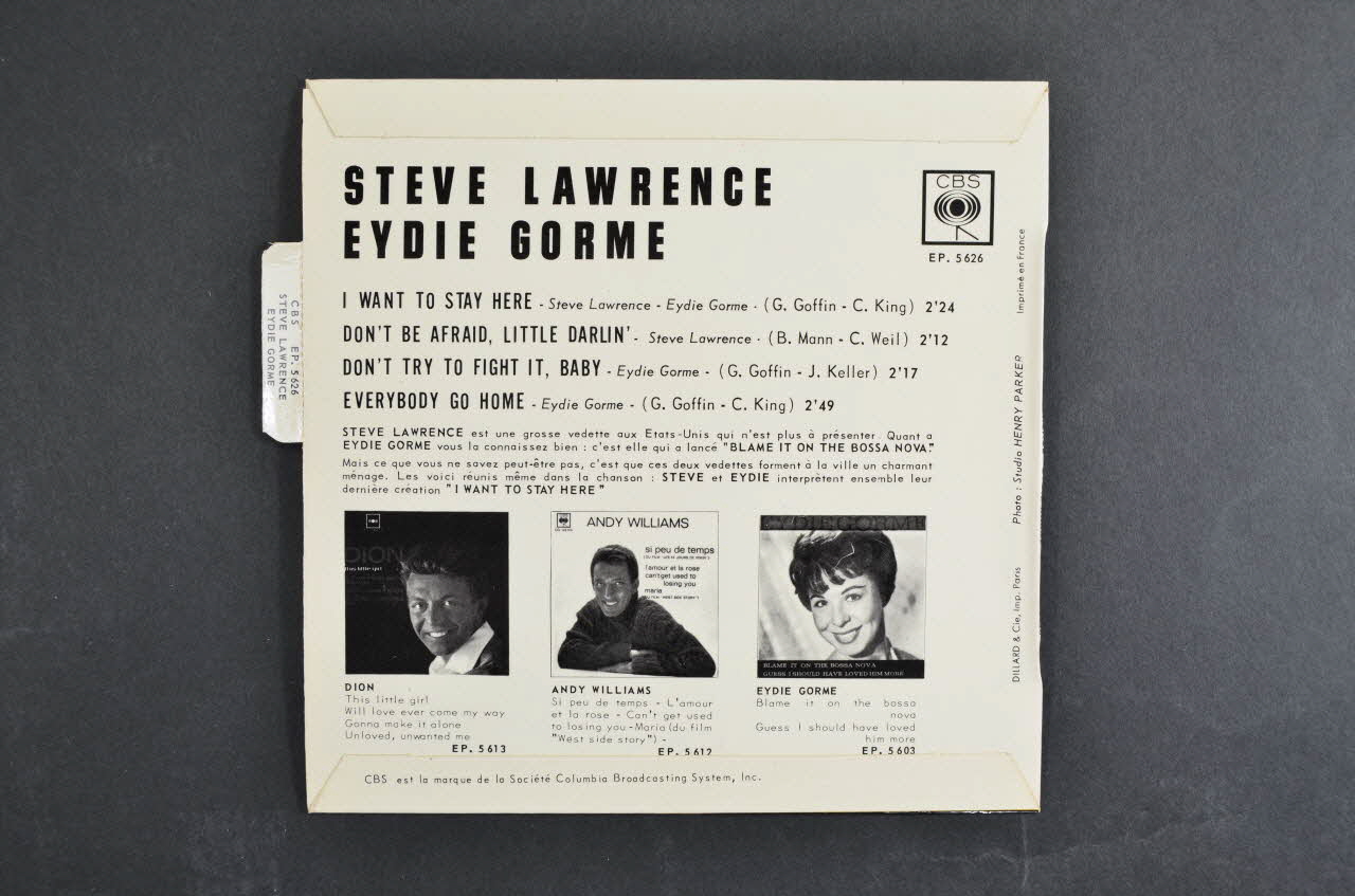 Au recto le fond représente la photo, en couleur du chanteur et de la chanteuse. En haut figurent des inscriptions bleues et blanches. Au verso, le fond est blanc avec des inscriptions noiresMatériaux et techniques
