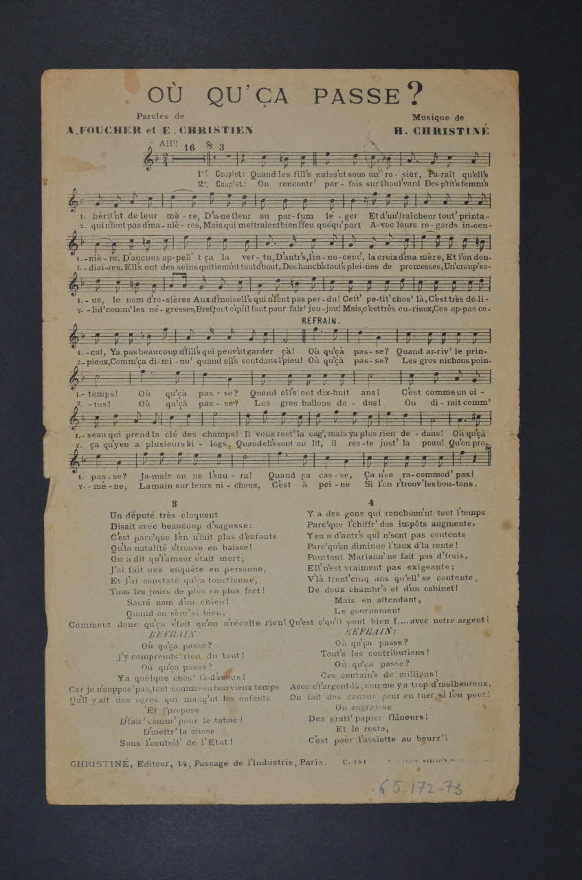 Au recto, le portrait photographique en médaillon de Henri Christiné accompagnant les inscriptions qui renseignent le titre de la chanson, le nom des auteurs, des artistes et de l'éditeur. Au verso, partition et paroles de la chanson.Matériaux et techniques