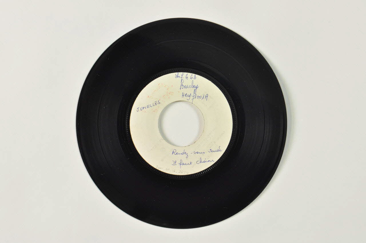 Ce disque en vinyle noir présente une forme circulaire avec évidement central. Des étiquettes de papier blanc portant des inscriptions manuscrites concernant les titres et l'artiste sont collées sur les deux faces, autour de l'évidement.Matériaux et techniques