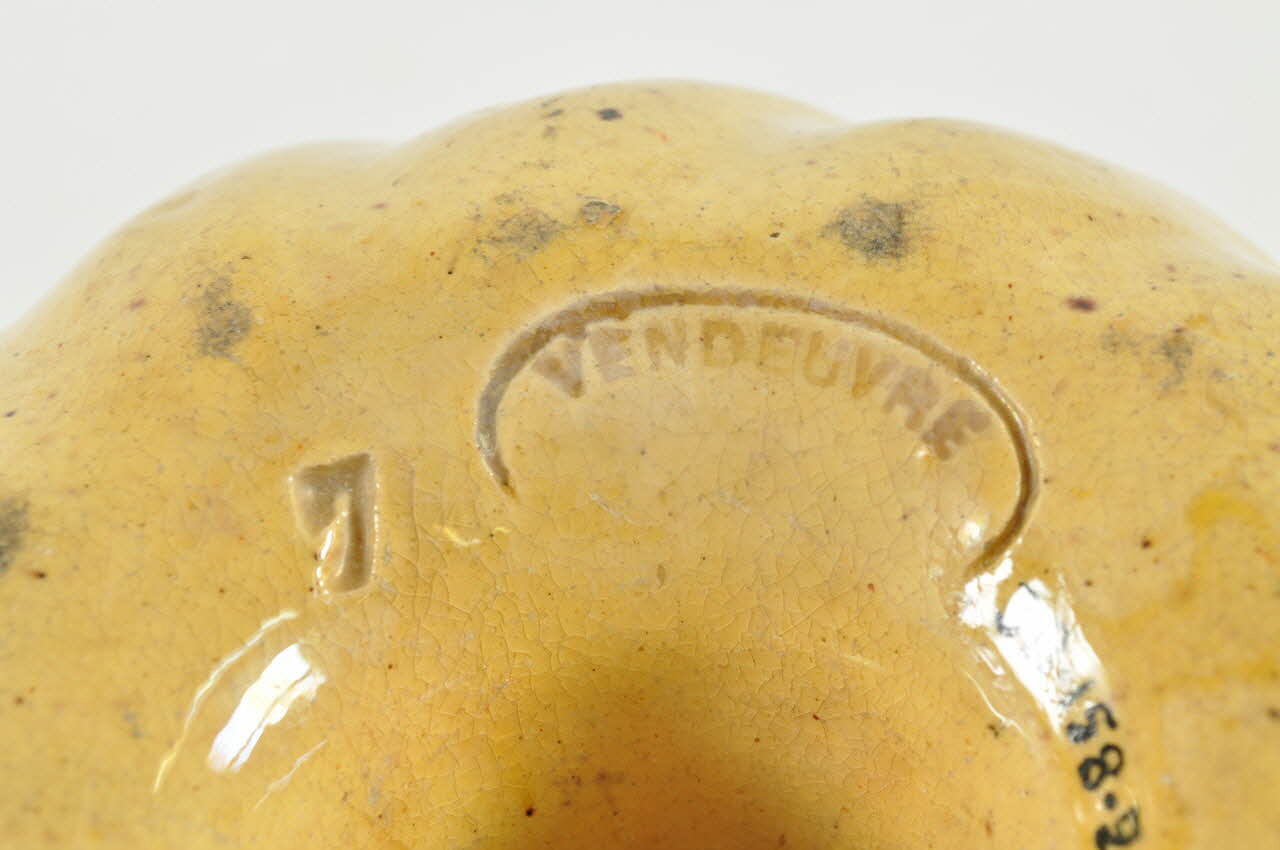 Argile moulée, à glaçure jaune, estampée / En terre cuite moulée, sur plan circulaire, à bords évasés et godronnés, terminé par un rebord supérieur plat. Une protubérance conique ajourée est fixée au centre du moule. Un tampon et une inscription sont gravés sur le fond.Décor