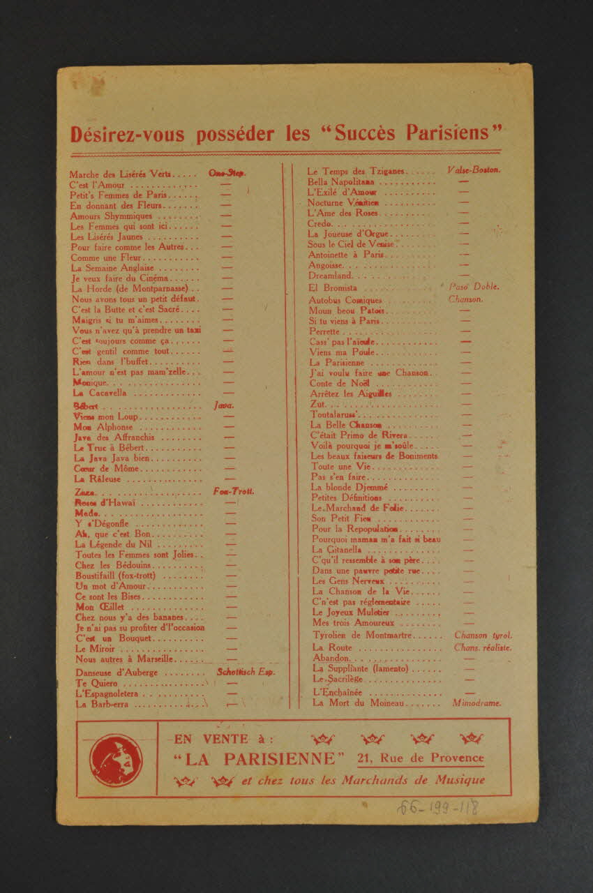 Les inscriptions renseignent le titre de la chanson, le nom des auteurs, de l'artiste et de l'éditeur. A l'intérieur, partitions et paroles de la chanson. Au dos, liste d?autres partitions publiées par l?éditeur.Décor