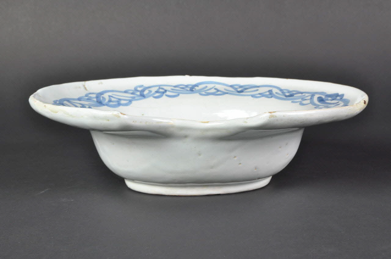 Faïence émaillée, décor au pinceau / Plat à barbe bleu clair à haut bord évasé et marli. Décor peint en bleu plus foncé. Sur le marli décor d'arabesques peintes. Au fond décor végétal stylisé. Au dos, pied couronne deux trous pour suspension.Décor