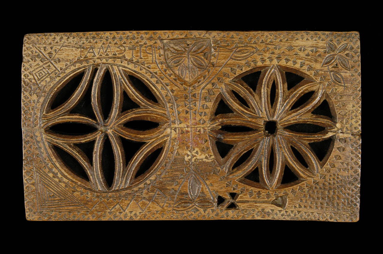 Bois taillé, ajouré / Rectangulaire. Décor géométrique. D'un côté 2 rosaces ajourées, à 4 et 8 feuilles. Inscription. 2 écussons avec fleurs, encadrement dents de scie combinées en losange. De l'autre côté, 3 écussons avec feuilles, 1 petite rosaceDécor