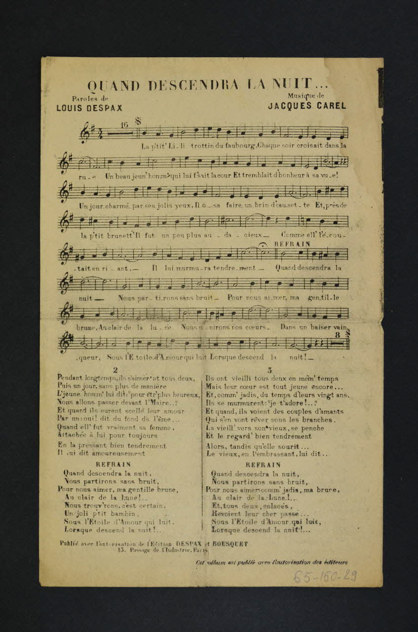Des inscriptions renseignent le titre, les auteurs, les exécutants et l'éditeur. A l'intérieur et au dos, les partitions et paroles des chansons.Décor
