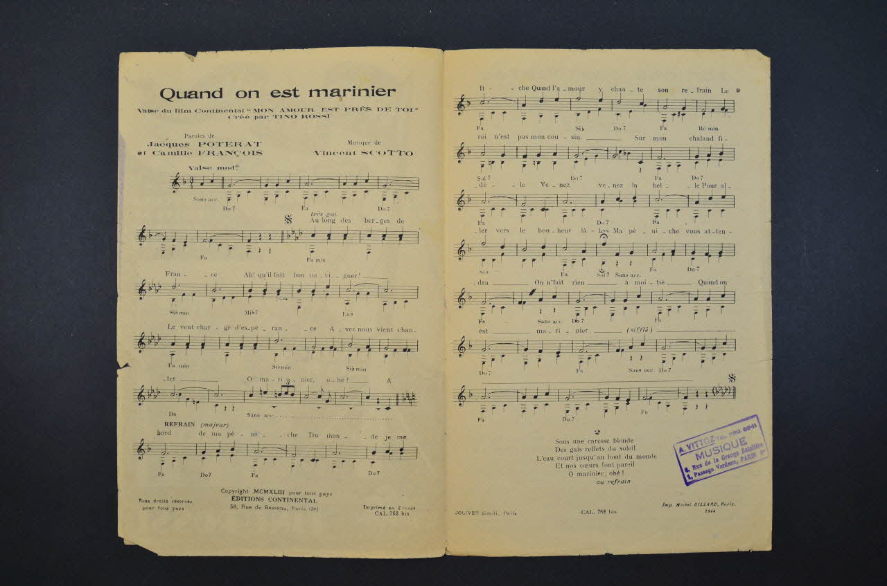 Sur la couverture, le portrait photographique de Tino Rossi tenant un cheval blanc ; au-dessus, représentation stylisée d'un mât avec drapeaux et nuages. Les inscriptions renseignent le titre de la chanson, le nom des auteurs, de l'artiste et de l'éditeur. A l'intérieur, partition et paroles de la chanson. Au dos, liste d'autres partitions publiées par l'éditeur.Décor