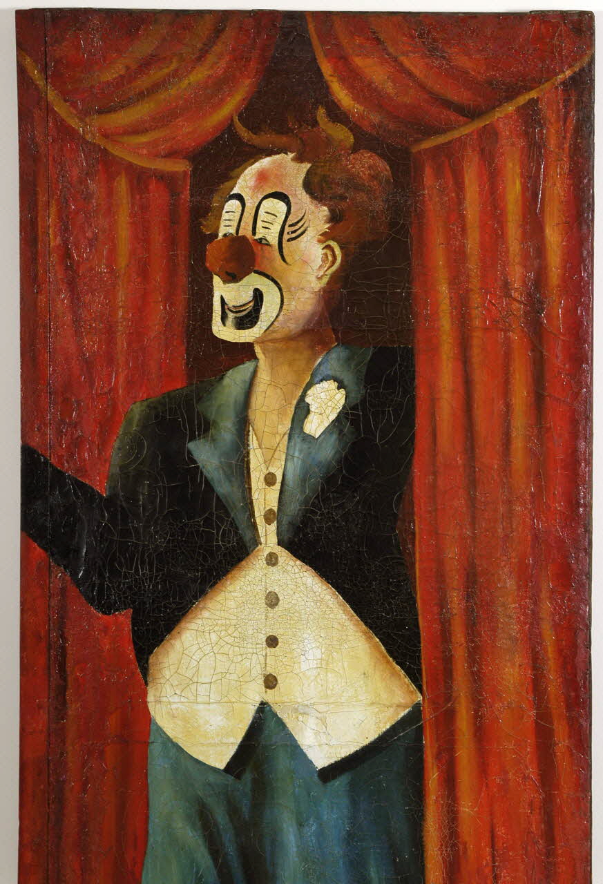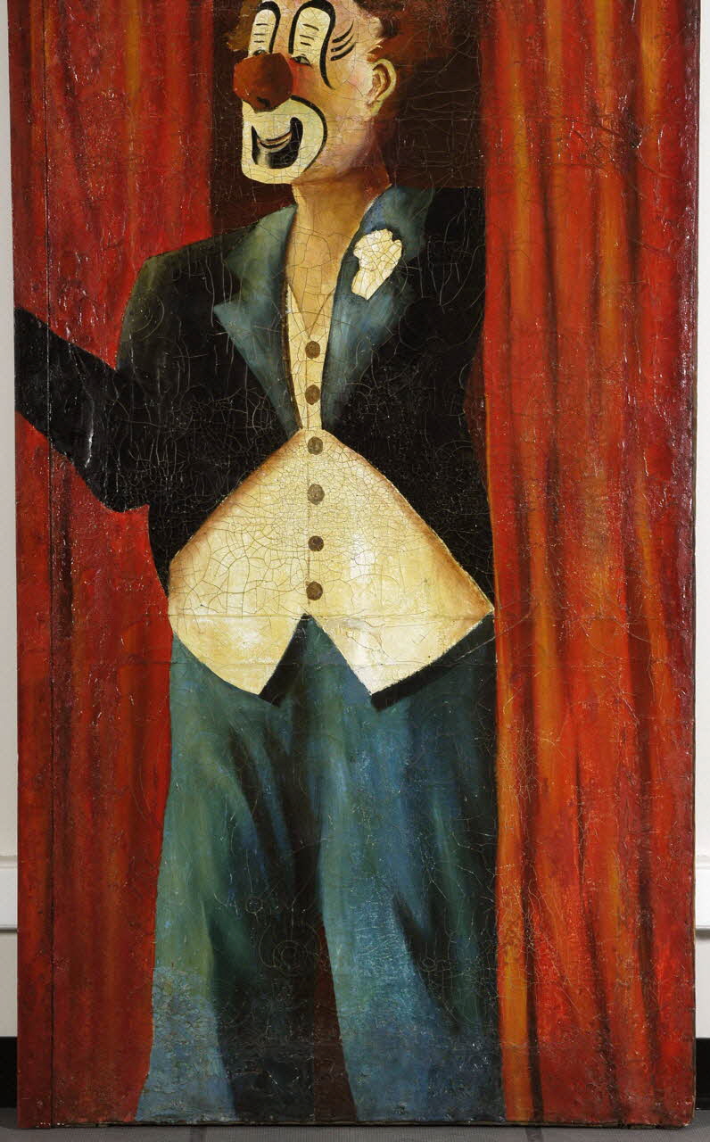 Toile montée sur un chassis peint en bordeau représentant l'Auguste le clown au nez rouge ayant un maquillage blanc, rouge et noir. Il porte une perruque et un costume burlesque. Représenté de trois quart face, il est tourné vers le spectateur. Sur la droite une pièce de métal fait toute la longueur de la peinture. Au dos des pièces de métal viennent renforcer le bois. Deux crochets noirs sont vissés sur la partie supérieure au dos.Matériaux et techniques