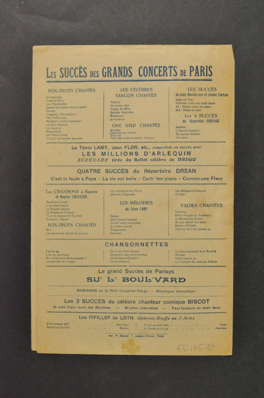 Des inscriptions renseignent le titre, les auteurs, les exécutants et l'éditeur. A l'intérieur, partition et paroles de la chanson. Au dos, liste d'autres partitions publiées par l'éditeur.Décor