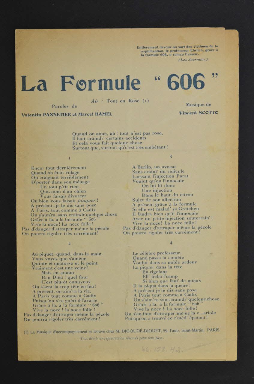 Au recto, représentation, à gauche, d'une tête monstrueuse avec oeil énucléé, oreille déchirée et et crâne fendu ; à droite, tête d'homme gracile avec moustaches et coiffure entretenues. Les inscriptions renseignent le titre de la chanson, le nom des auteurs, des artistes et de l'éditeur. Au verso, paroles de la chanson.Décor