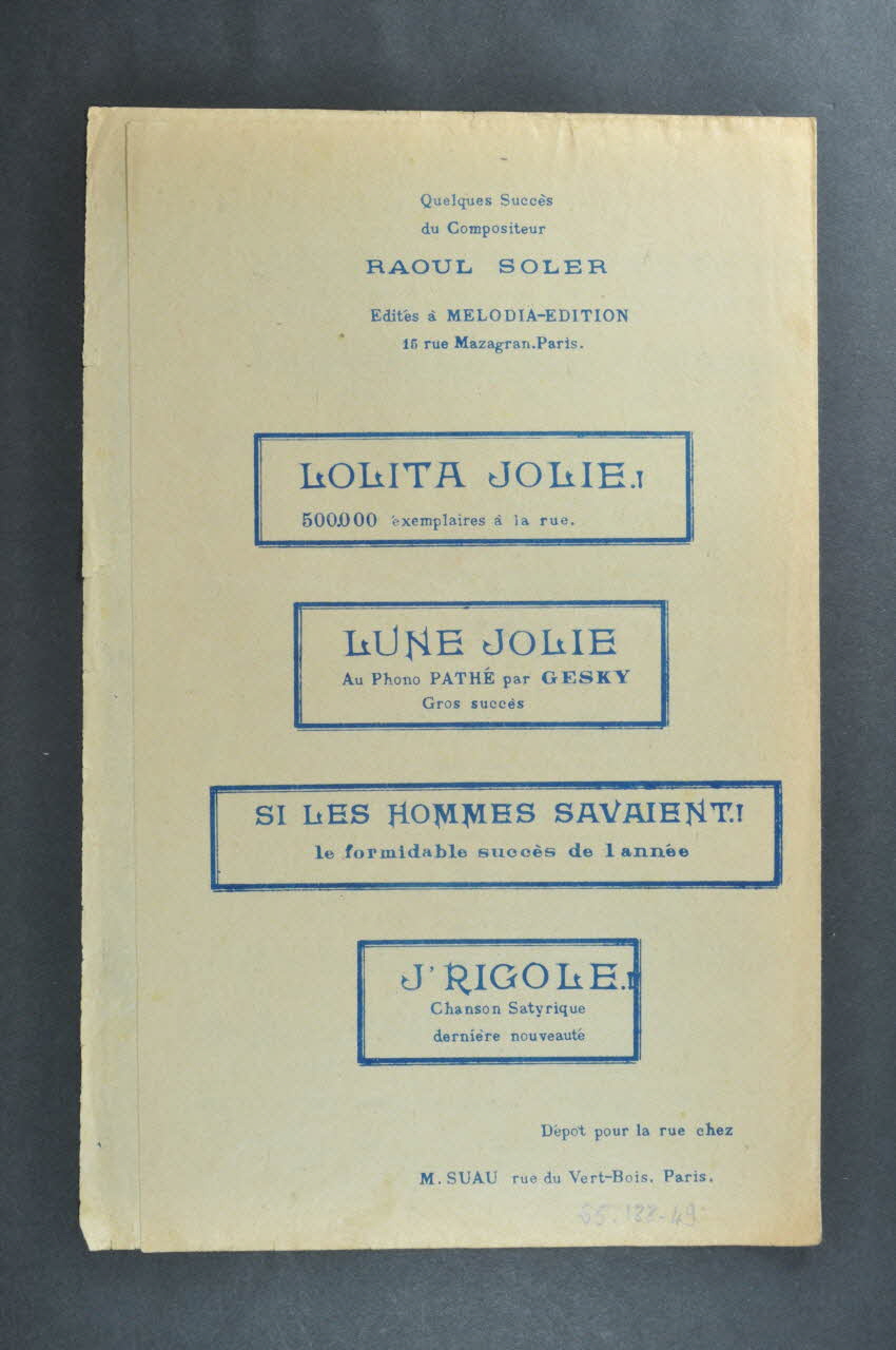 Les inscriptions renseignent le titre de la chanson, le nom des auteurs, de l'artiste et de l'éditeur. A l'intérieur, partitions et paroles de la chanson. Au dos, liste d?autres partitions publiées par l?éditeur.Matériaux et techniques