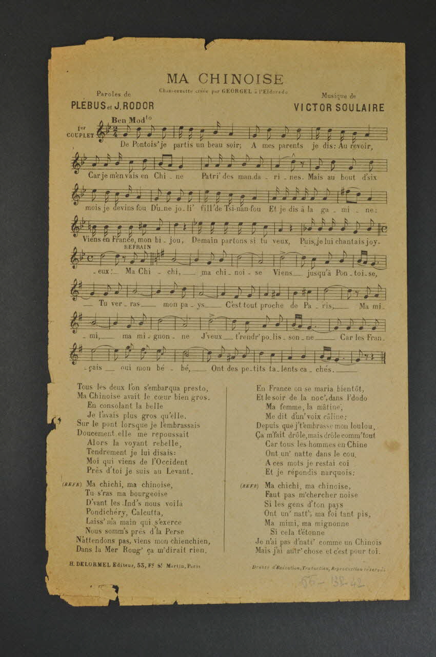 Les inscriptions renseignent le titre de la chanson, le nom des auteurs, de l'artiste et de l'éditeur. Au dos, partitions et paroles de la chanson. L'intérieur est laissé vierge.Décor