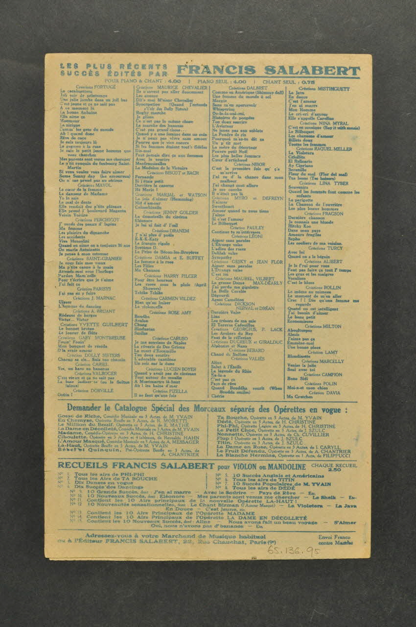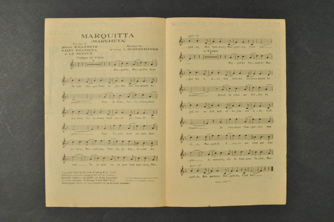 Des inscriptions renseignent le titre, les auteurs, les exécutants et l'éditeur. A l'intérieur, partition et paroles de la chanson. Au dos, liste d'autres partitions publiées par l'éditeur.Décor