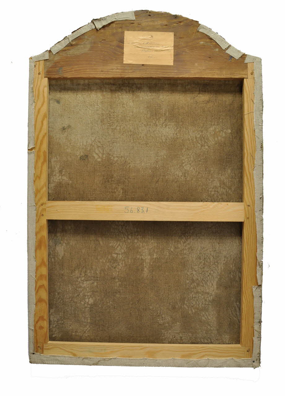 Huile sur toile de format rectangulaire avec la partie supérieure en demi-cercle, fixée sur un châssis en bois chanfreiné.