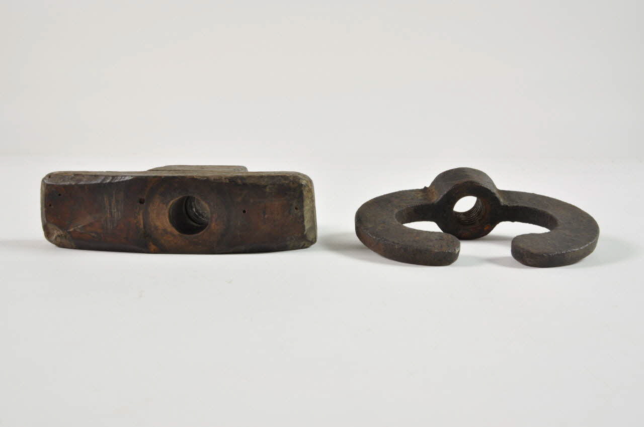 Longue vis, filetée sur l'extrémité et présentant une tête plate carrée, sur laquelle est passé un élément en bois. Celui-ci est formé de deux tasseaux superposés, formant un T. La pièce de bois est maintenue sur la vis par un large écrou muni de deux ailes.Matériaux et techniques