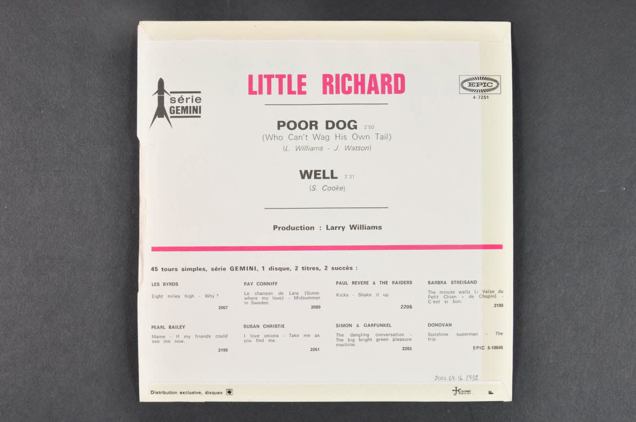 Sur le recto, figurent les noms du chanteur en rouge et des chansons dans la partie supérieure. En dessous, se trouve la photographie noir et blanc du chanteur. Le verso est composé d'inscriptions noires et roses sur fond blanc. Il présente les noms des chansons de l'album et d'autres albums de la même maison d'édition.Matériaux et techniques