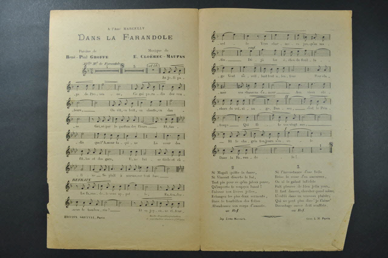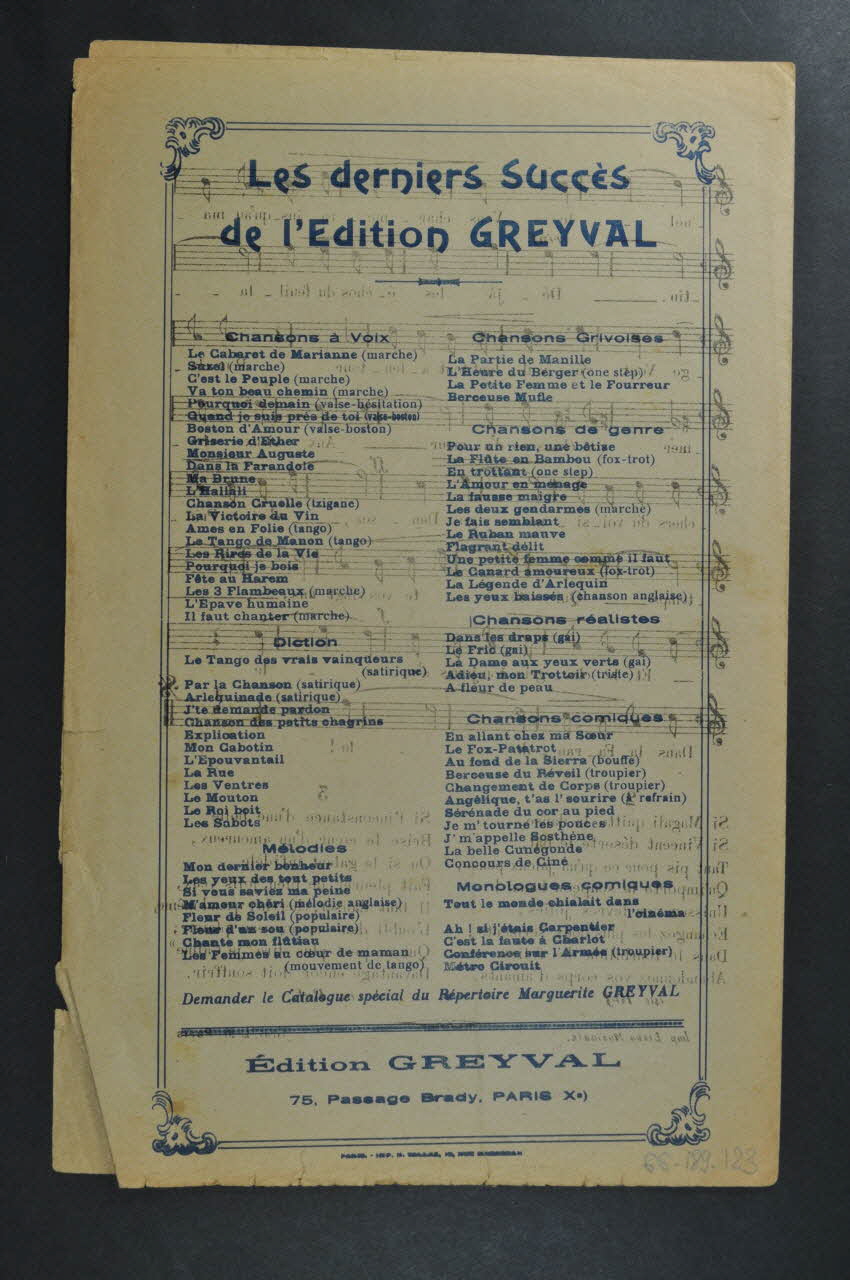 Les inscriptions renseignent le titre de la chanson, le nom des auteurs, de l'artiste et de l'éditeur. A l'intérieur, partitions et paroles de la chanson. Au dos, liste d?autres partitions publiées par l?éditeur.Décor