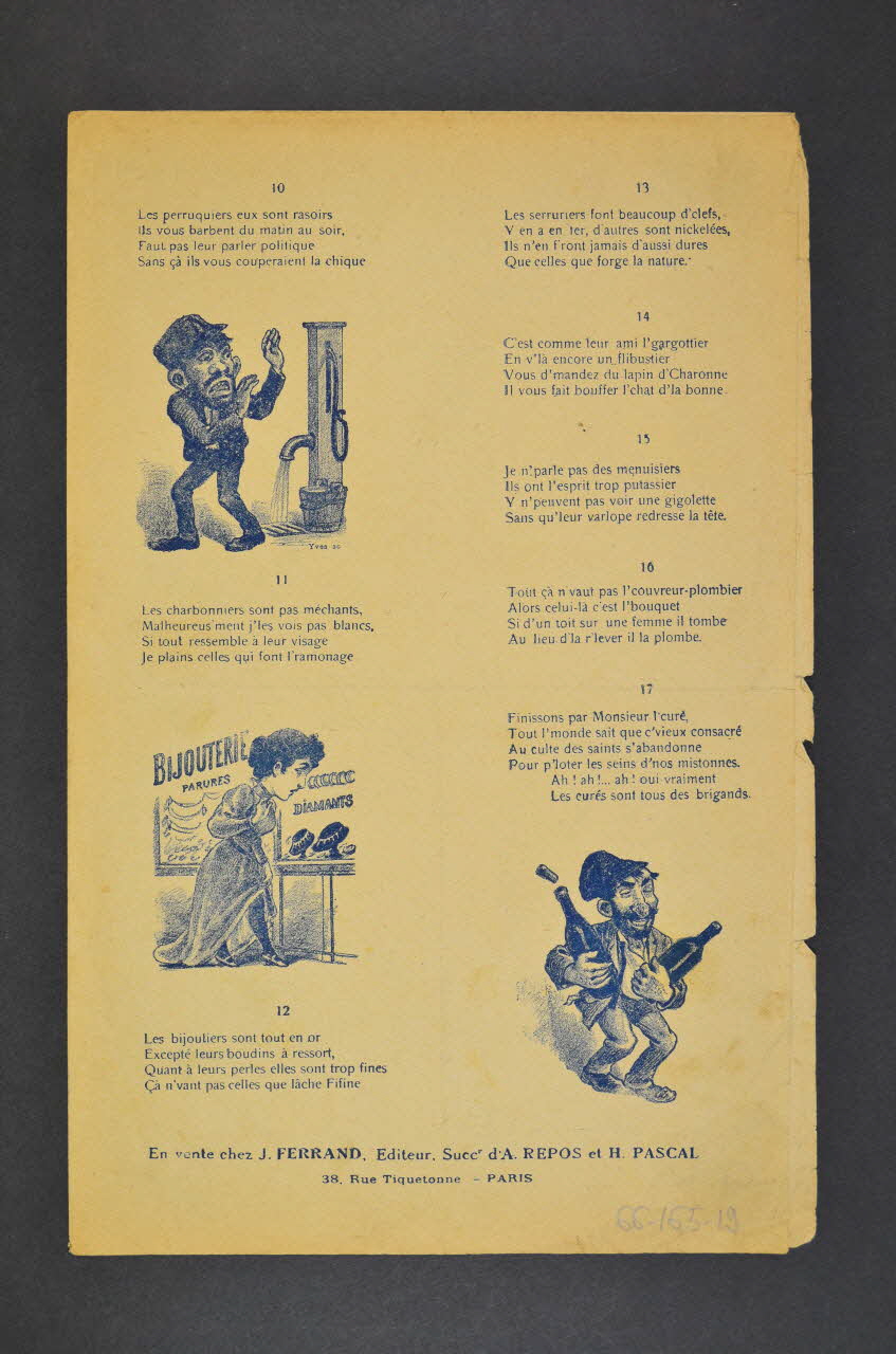 Feuillet rectangulaire en papier industriel, imprimé à l?encre bleue (sauf l?intérieur à l?encre noire). La couverture du feuillet présente des saynettes entrecoupant les paroles (un homme à table, un homme avec des cornes, une femme mangeant).