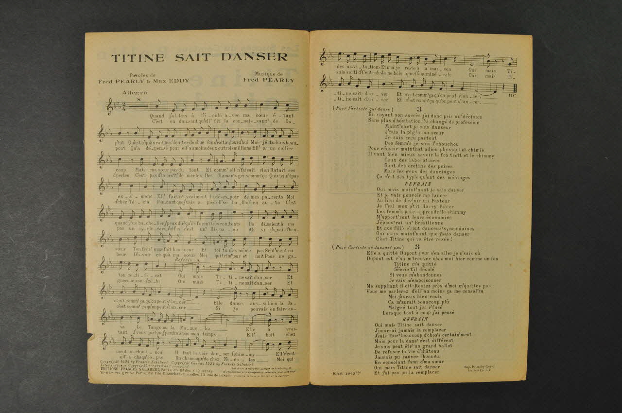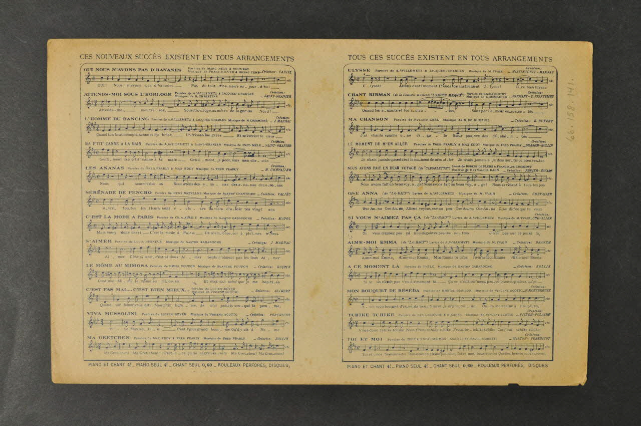 Des inscriptions renseignent le titre, les auteurs, les exécutants et l'éditeur. A l'intérieur, partition et paroles de la chanson. Au dos, liste d'autres partitions publiées par l'éditeur.Décor