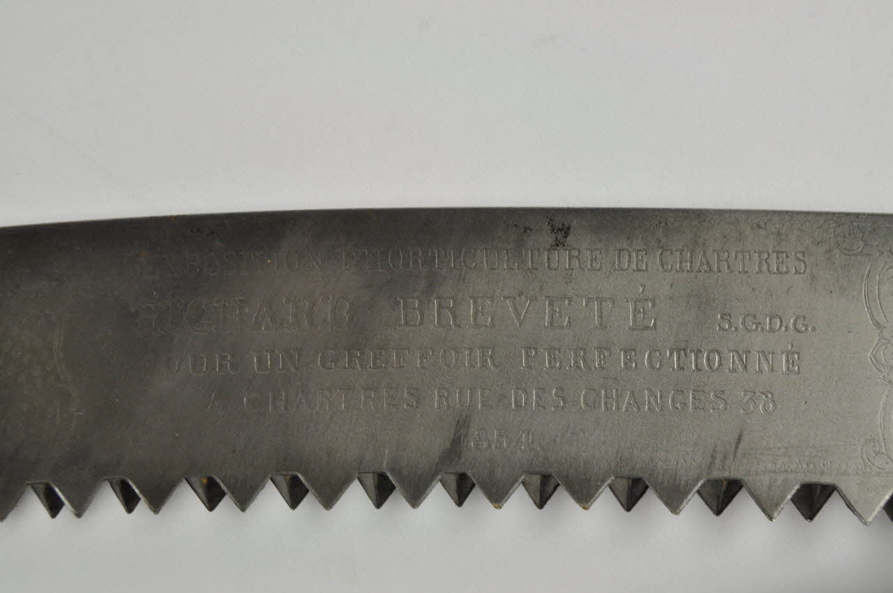 Grand couteau pliant. Manche de bois sculpté d'outils de métier et d'un personnage béchant, extrémité en tête de chien en relief avec incrustation d'yeux en verre. Lame en dent de scie, en quinconce avec inscription et motifs floraux.Matériaux et techniques