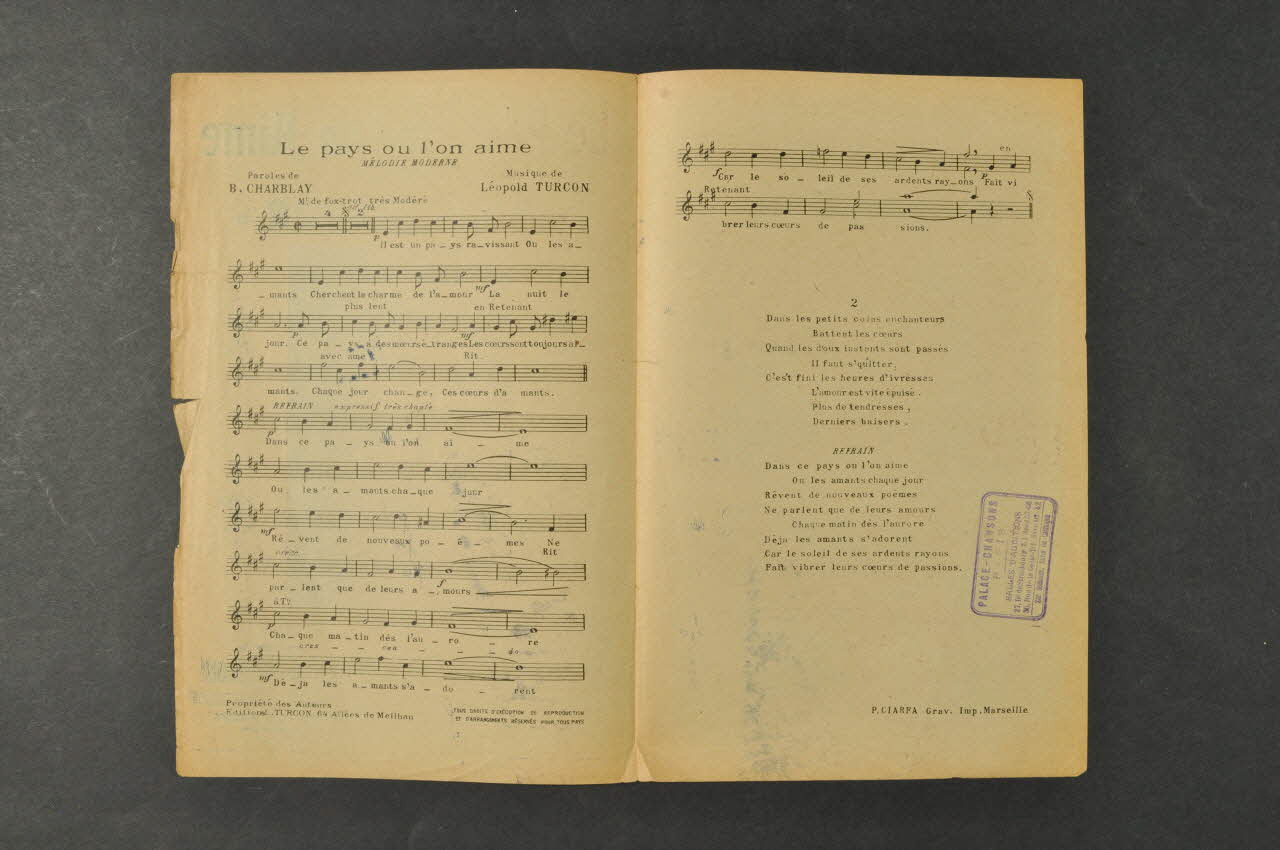 Les inscriptions renseignent le titre de la chanson, le nom des auteurs, de l'artiste et de l'éditeur. A l'intérieur, partitions et paroles de la chanson. Le dos est laissé vierge.Décor