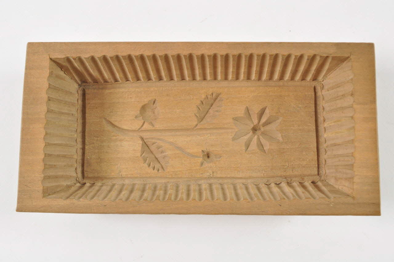 En bois, de forme rectangulaire à bords bas et légèrement évasés. Sur le fond, un décor de fleurs est gravé. Les côtés intérieurs sont couverts de rainures verticales.