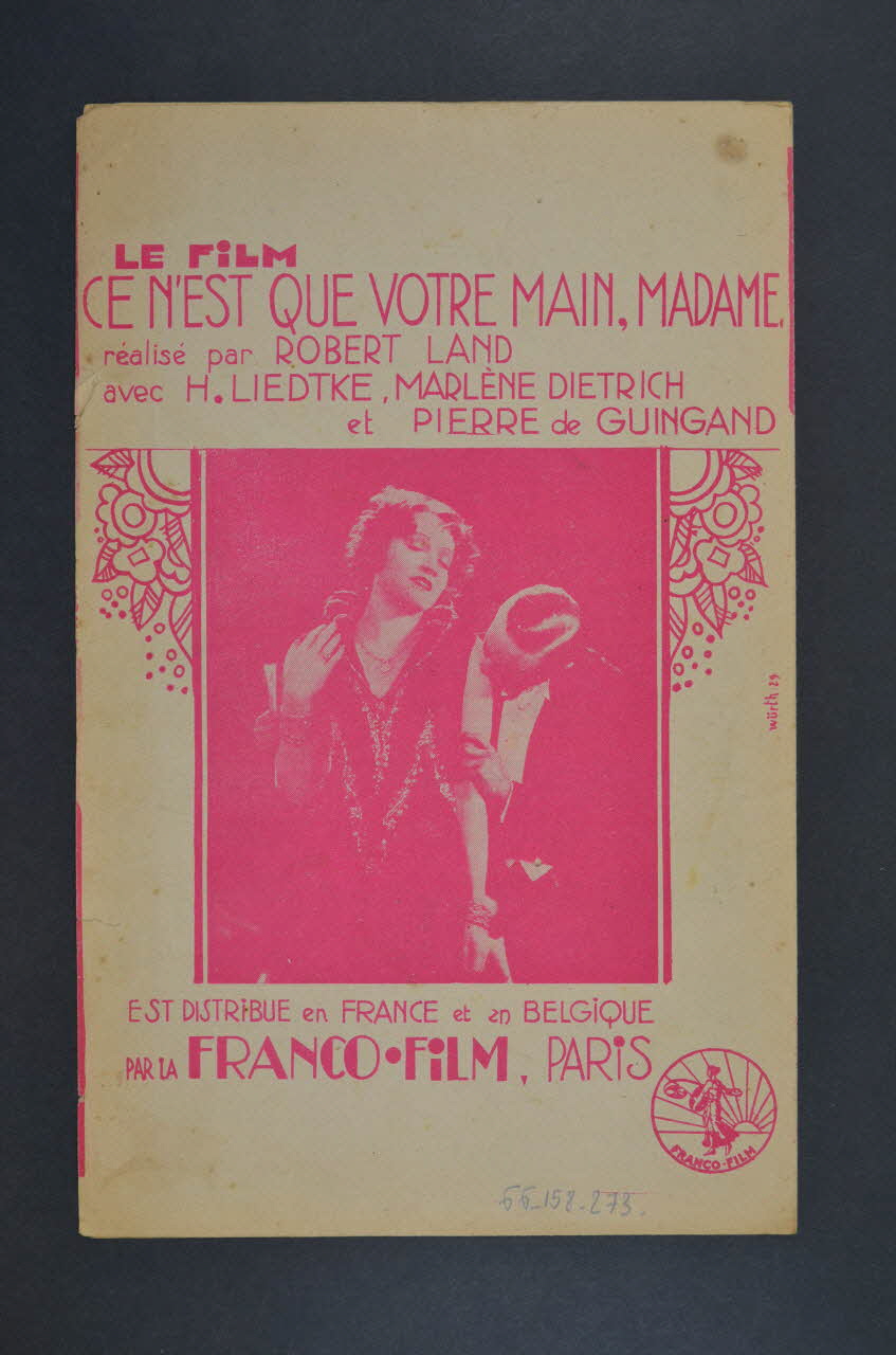 Feuillet rectangulaire en papier industriel imprimé à l'encre rose (sauf à l'intérieur, encre noire). Sur la couverture, un portrait photographique de Pizella dans un médaillon et le dessin d'un homme baisant la main d'une femme.