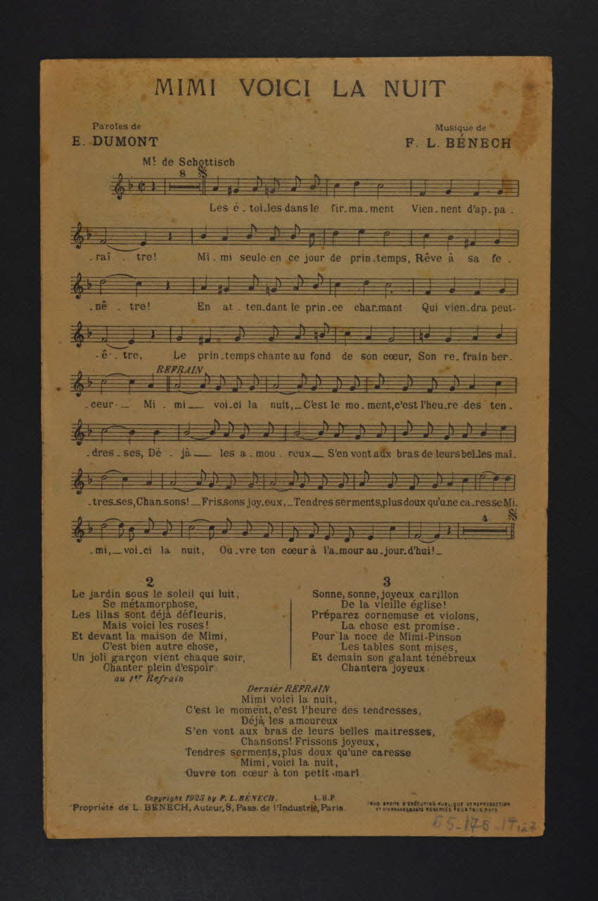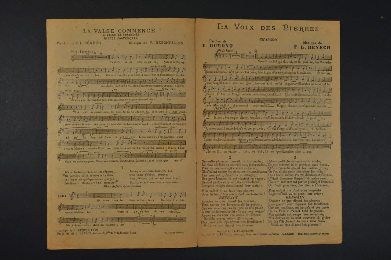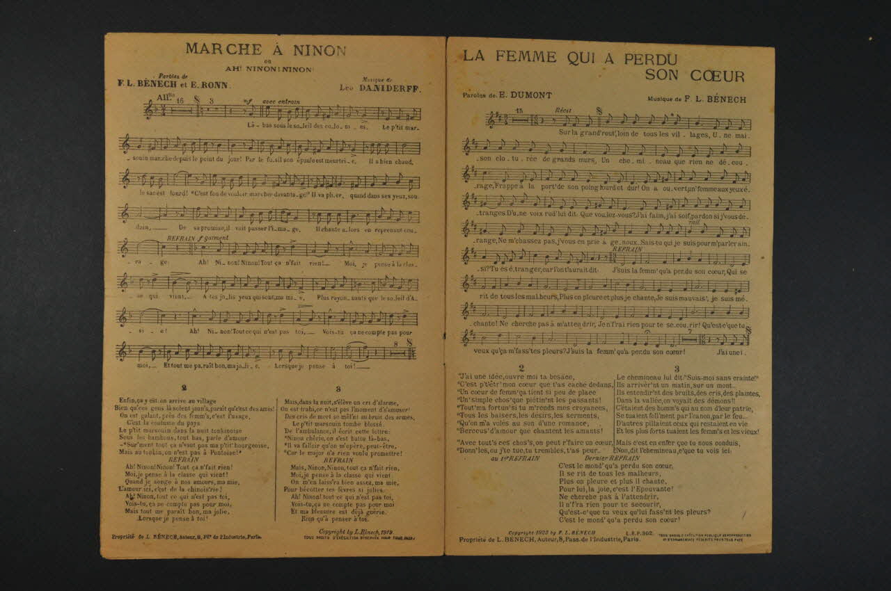 Des inscriptions renseignent les titres, les auteurs, les exécutants et l'éditeur. A l'intérieur et au dos, partition et paroles des chansons.Décor