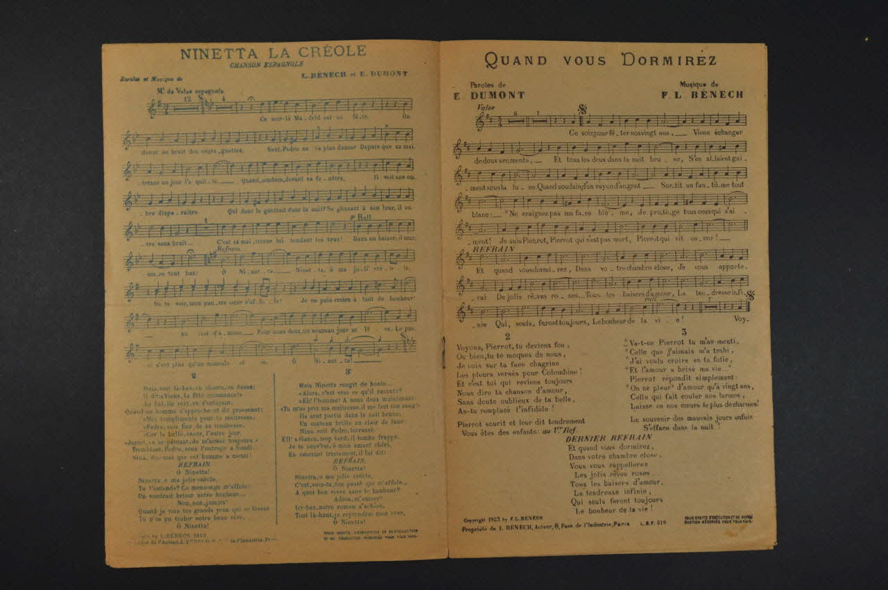 Feuillet rectangulaire en papier industriel imprimé à l'encre bleue (sauf à l'intérieur, encre noire). Sur la couverture, un portrait Bénech dans un médaillon et le visage d'une jeune femme tenant un éventail.