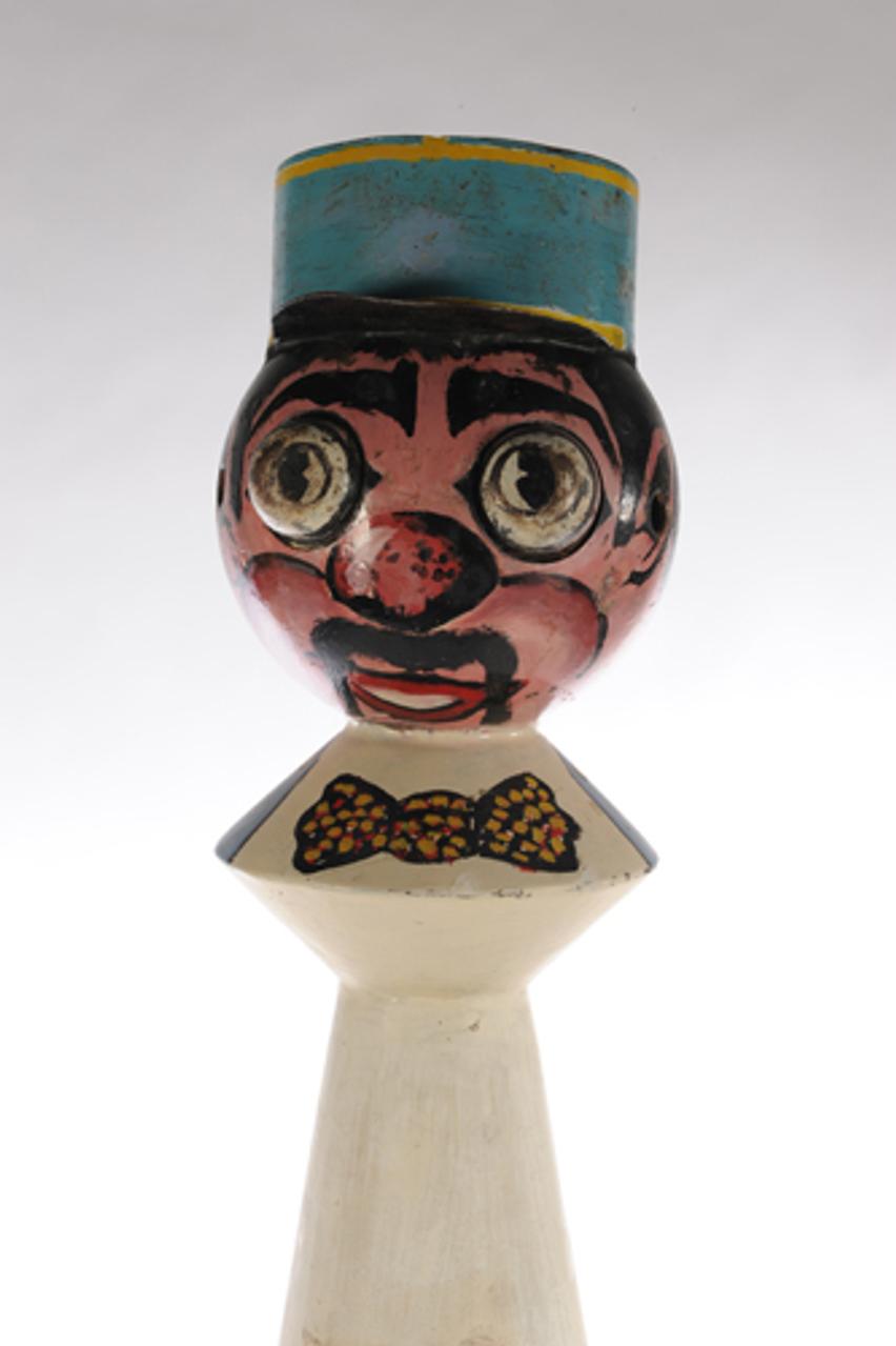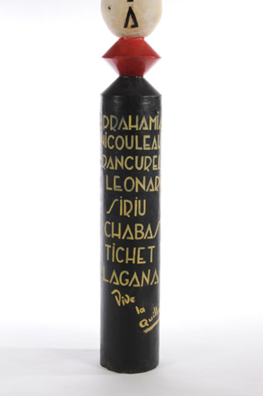 quille se terminant par la représentation d'une tête d'officier - képi bleu - noeud-papillon - épaulettes bleues - inscription noire (chiffres) sur le corps blanc tronconique et blanche sur la base cylindrique peinte en noir (noms des soldats) ; l'objet est entièrement peint.Inscriptions