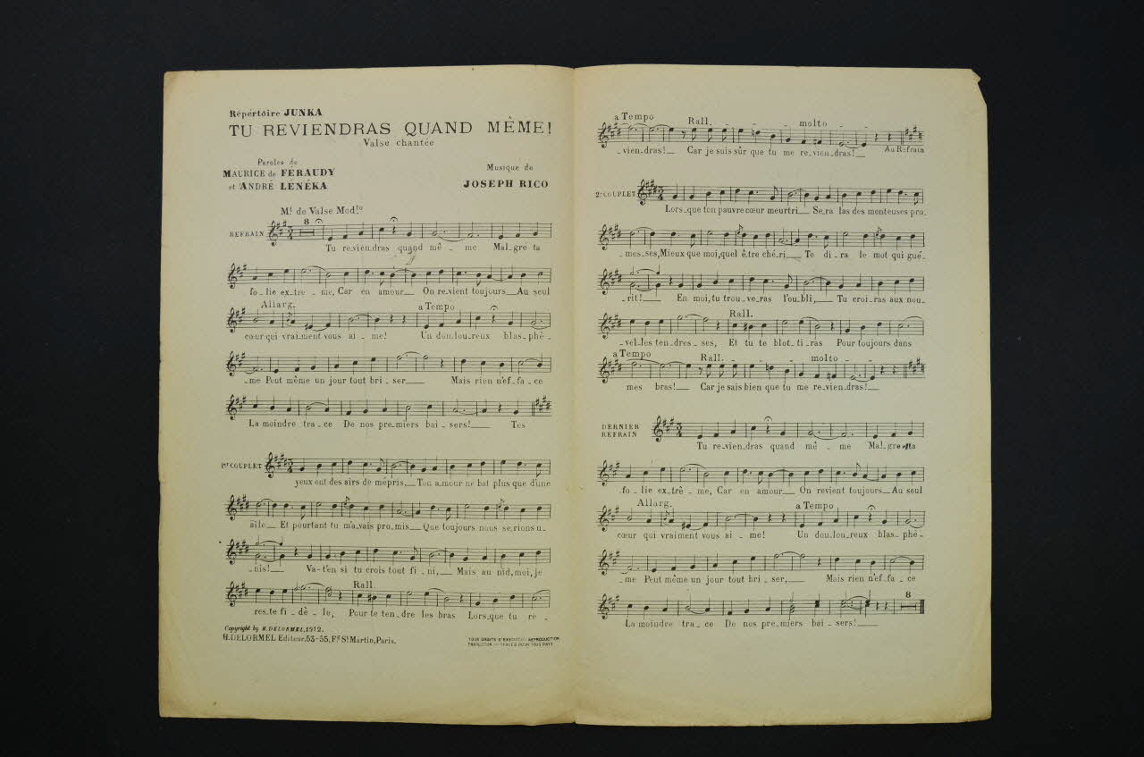 Les inscriptions renseignent le titre de la chanson, le nom des auteurs, de l'artiste et de l'éditeur. A l'intérieur, partitions et paroles de la chanson. Au dos, liste d?autres partitions publiées par l?éditeur.Décor