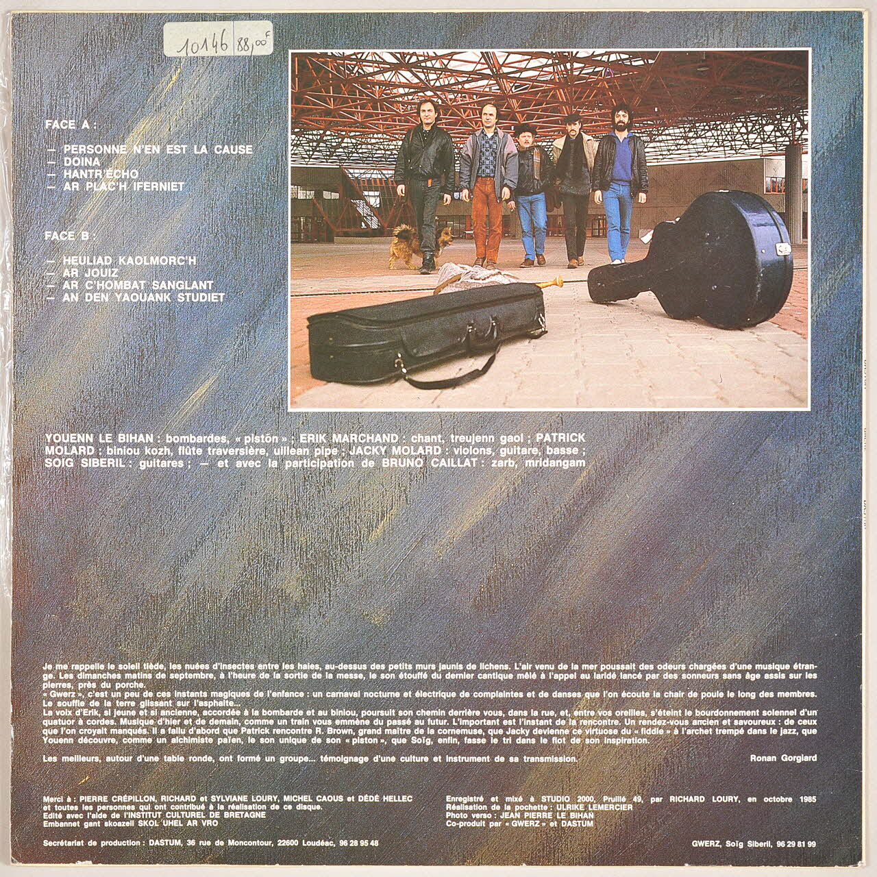 Le verso de la pochette présente sur un fond bleu évoquant une peinture en gros plan, une photo du groupe en couleur, en format paysage dans le coin supérieur droit. Le groupe, composé de cinq hommes se tient dans une cour surmontée d'un auvent métalique, derrière deux boîtes d'instruments de musique et un biniou. Un chien se tient derrière l'homme situé le plus à droite. Le reste du verso est occupé par l'indication des titres, la composition du groupe et en bas un texte de Ronan Gorgiard à propos du groupe. L'étiquette du vinyle présente un fond gris sur lequel se trouvent les titres des chansons et le nom du groupe de couleur argentée.Inscriptions