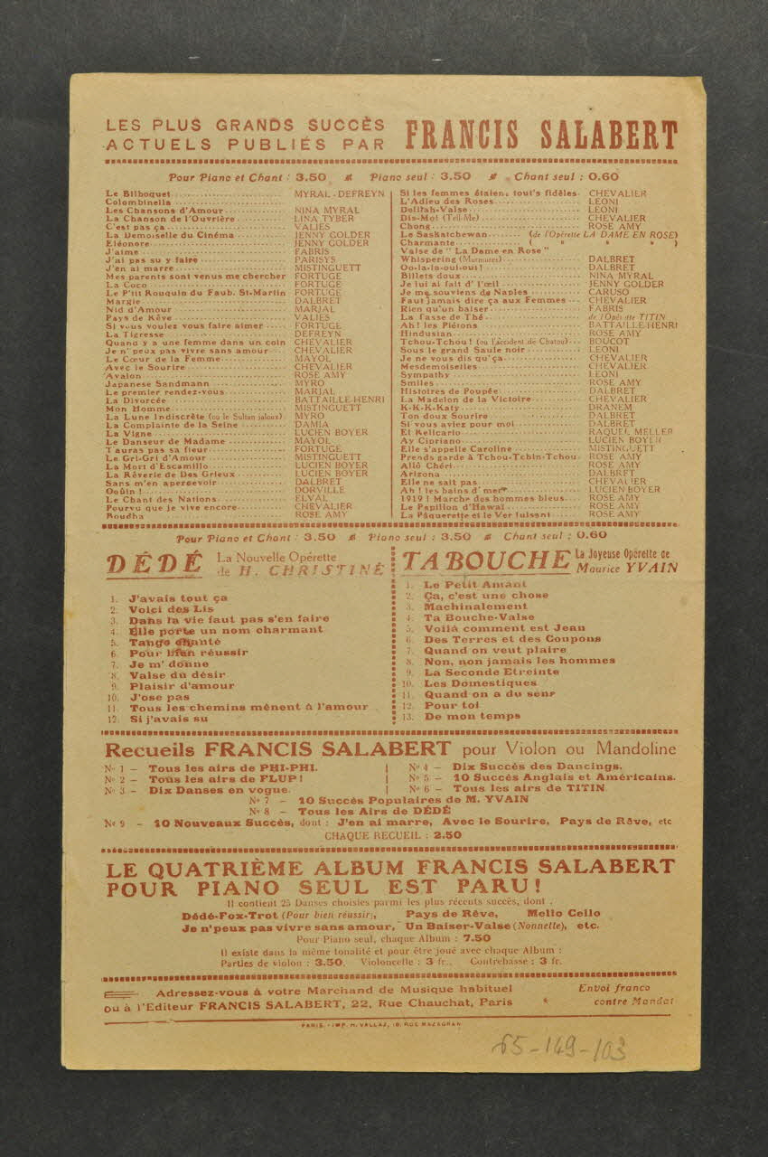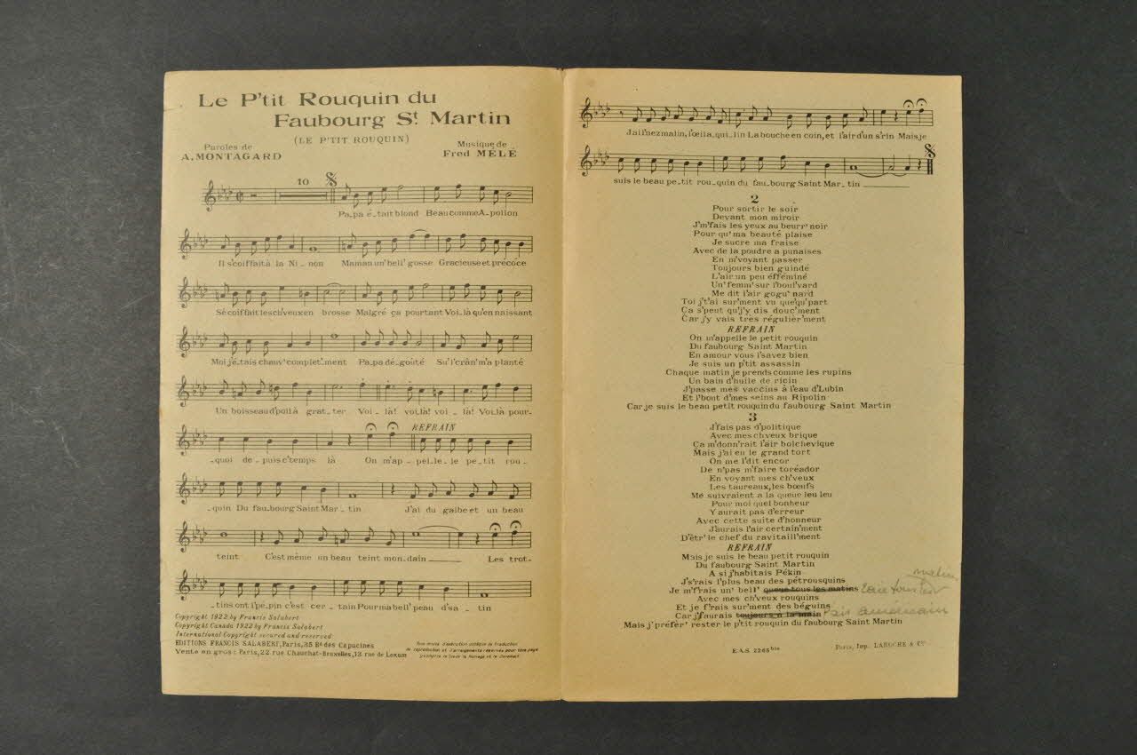 Les inscriptions renseignent le titre de la chanson, le nom des auteurs, de l'artiste et de l'éditeur. A l'intérieur, partitions et paroles de la chanson. Au dos, liste d?autres partitions publiées par l?éditeur.Matériaux et techniques